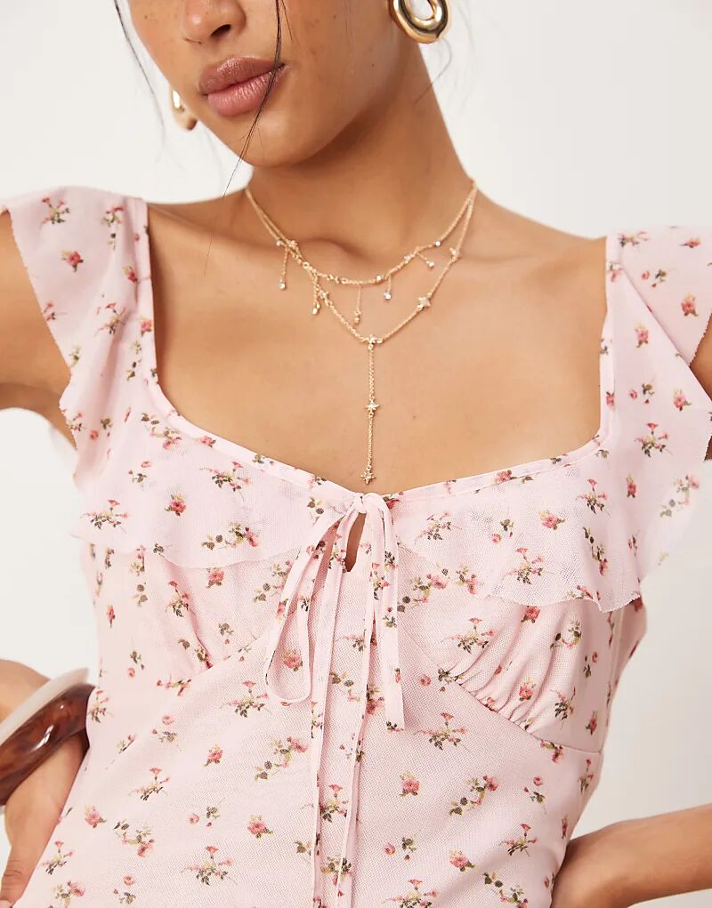 Платье-мини с сетчатым лифом и оборками ASOS DESIGN в розовых тонах