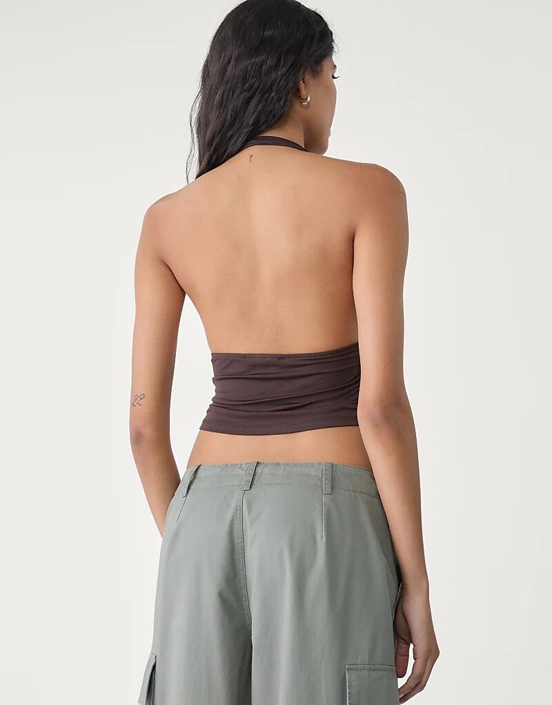 Топ Stradivarius со сборками на бретелях коричневого цвета