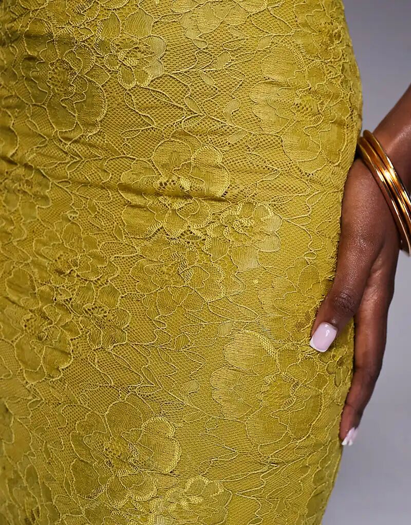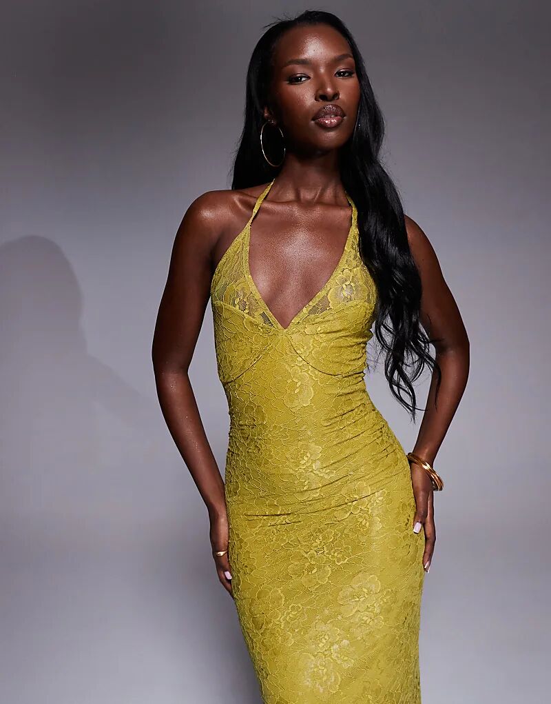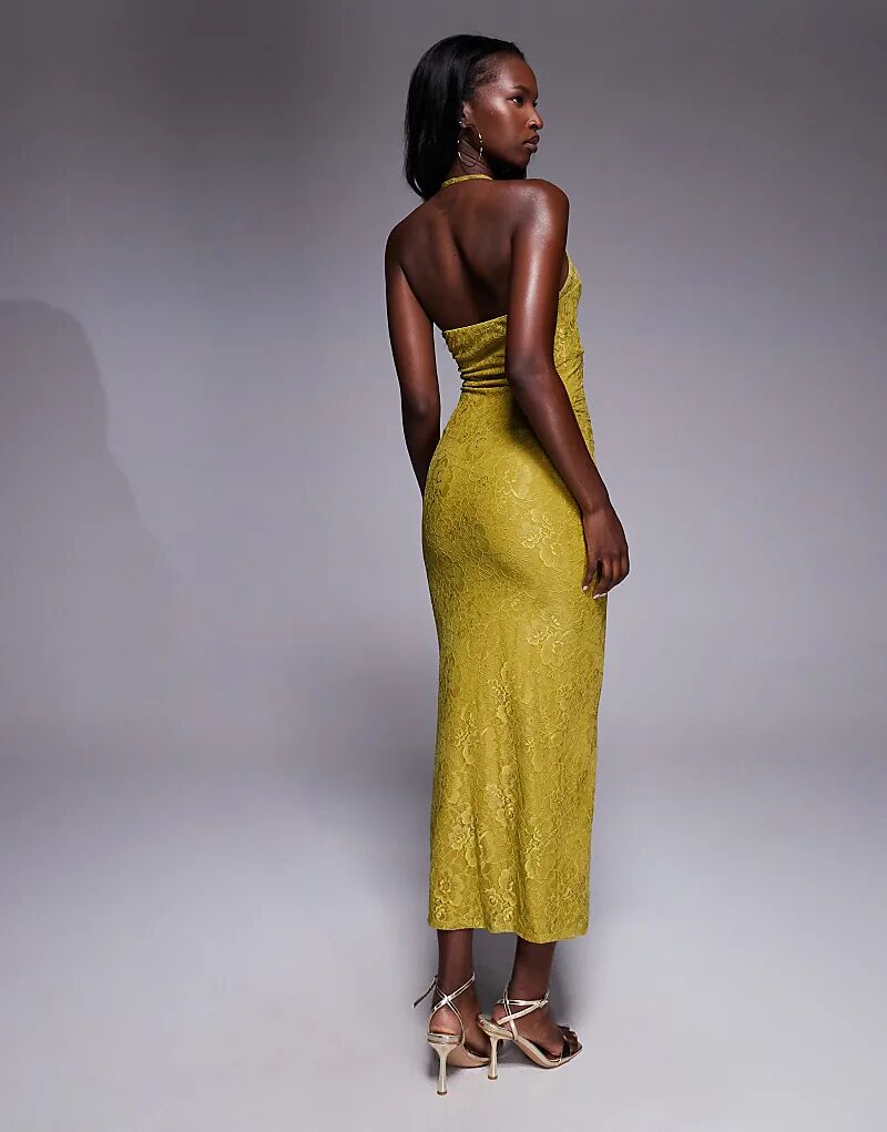 Длинное платье-халтер с кружевом ASOS DESIGN цвета шартрез