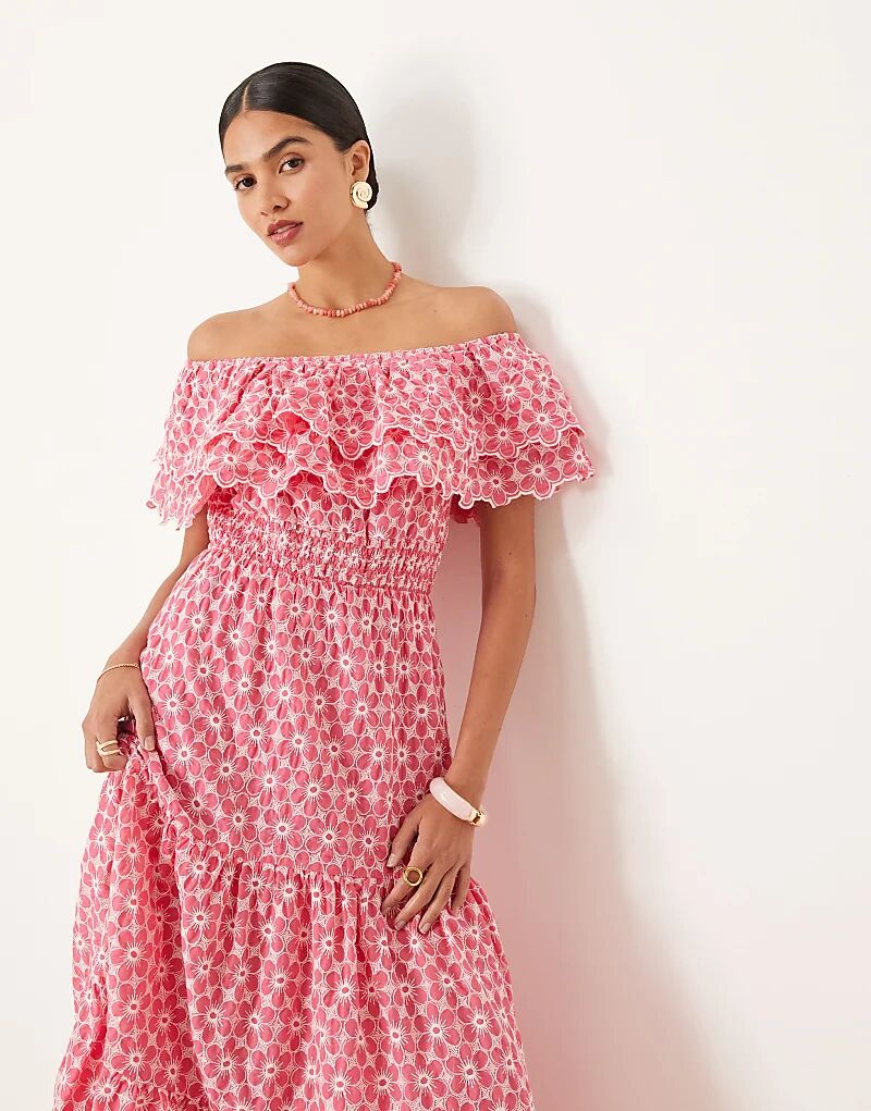 Платье миди Lovedrobe с вышитым вырезом Bardot в розовом цвете 9 954₽