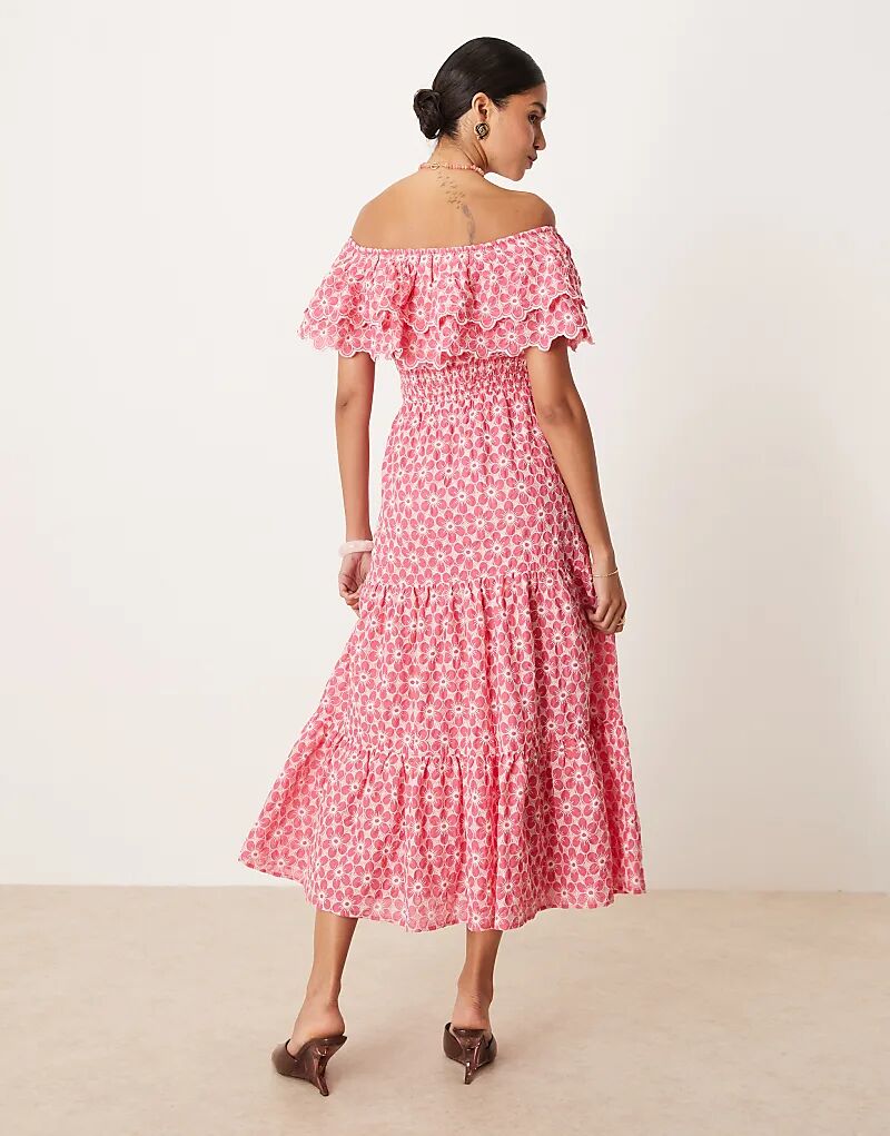 Платье миди Lovedrobe с вышитым вырезом Bardot в розовом цвете