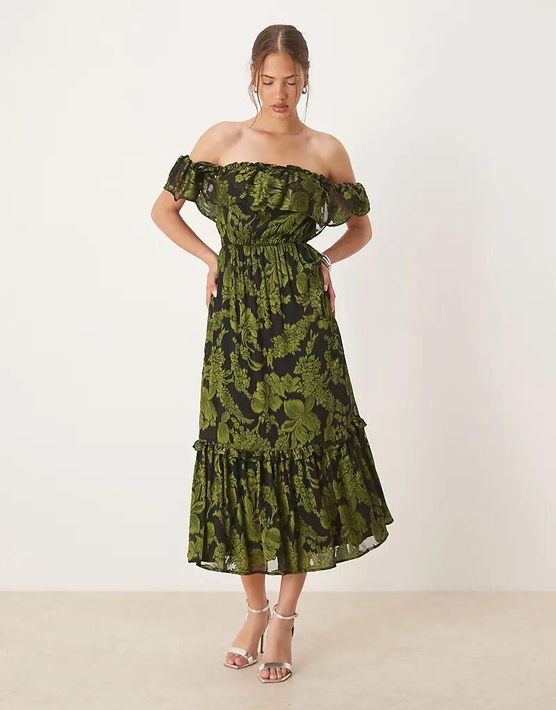 Платье-мидакси Maya Floral Bardot зеленого цвета