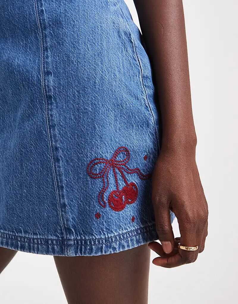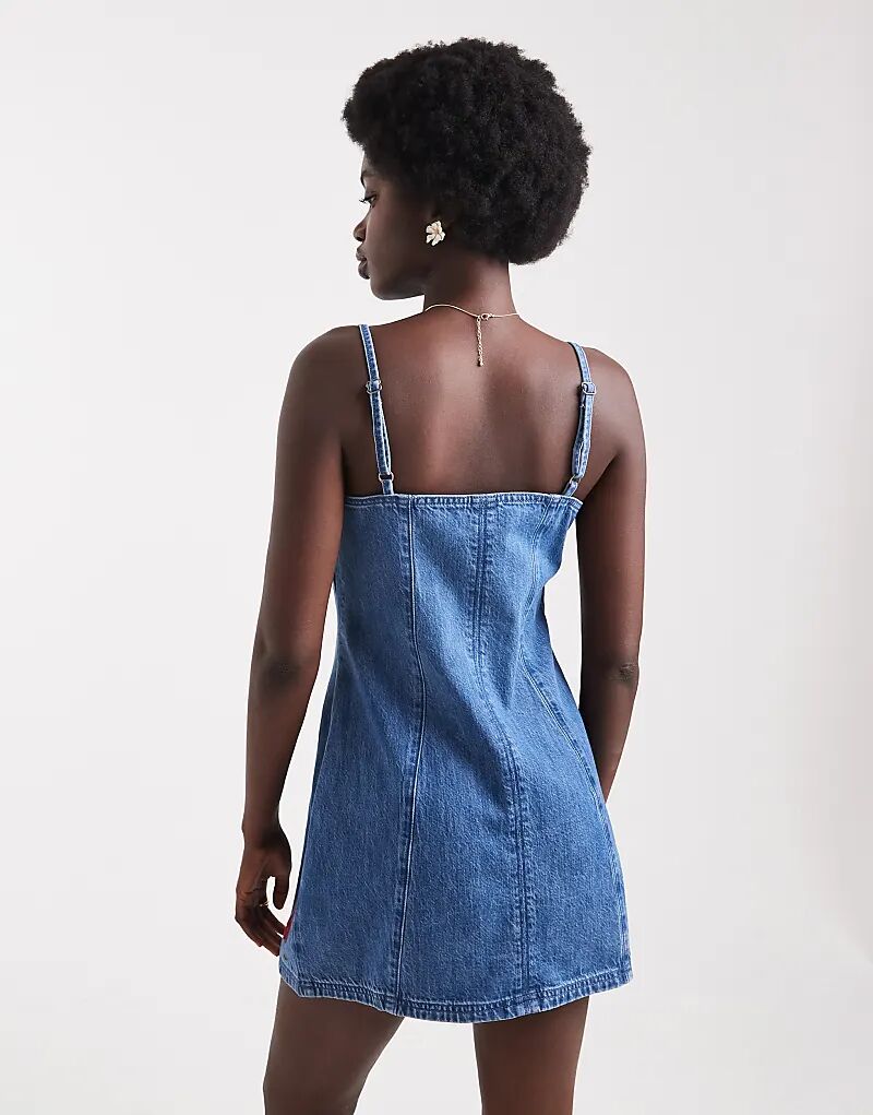 Джинсовое мини-платье Hollister с тонкими бретельками, средне-синего цвета