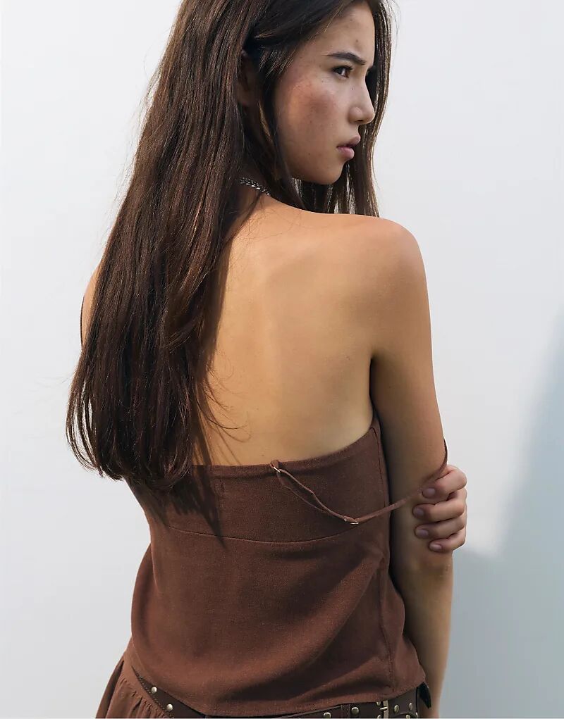 Льняной топ с бретельками Pull&Bear коричневого цвета