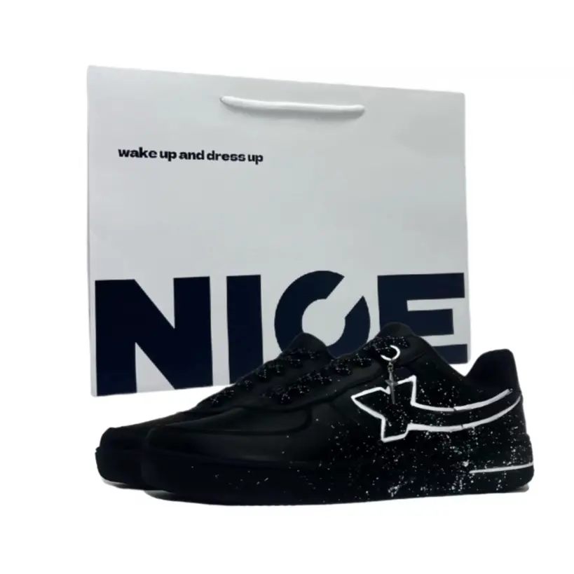 Эта кастомная модель - оригинальная модель Xtep Air Force One 1, номер детали 881219319851-15 (Team1049-Galaxy LD), а номер вспомогательной детали - 881218319851-14. Обувь выполнена в свежей, чистой черно-белой цветовой гамме, воплощающей минималистичную эстетику. Дизайн вдохновлен темной галактикой. Минималистичный дизайн обуви отличается мягким, дышащим верхом и нескользящей, износостойкой подошвой, что делает ее подходящей для повседневной носки в любое время года. Каждая пара кастомной обуви изготавливается вручную, поэтому незначительные отклонения являются нормой. Их можно носить на улице даже под дождем. Пожалуйста, дайте им постоять 10 дней перед тем, как надеть. Из-за различий в фото-/демонстрационном оборудовании, цветовой температуре источника света и других факторах могут быть небольшие отклонения в цвете между изображением на дисплее и фактической обувью. Кастомную обувь можно носить и стирать как обычно, но избегайте интенсивных физических нагрузок и царапин острыми предметами. Избегайте использования высококонцентрированных органических растворителей при чистке. Рекомендуем использовать мягкую щетку и моющее средство соответствующей концентрации.