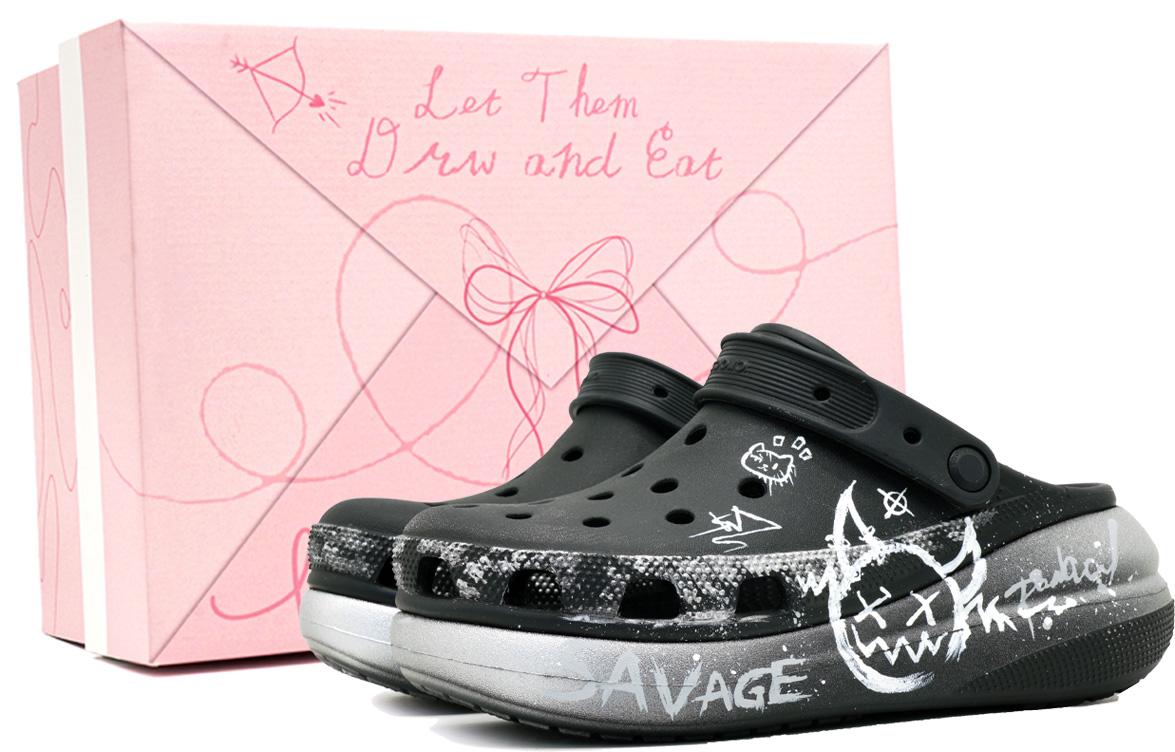 Оригинальная обувь, использованная в этой модели, - это туфли Cros Classic Crush с перфорацией, артикул 207521-001, черный. Эта пара кроссовок с перфорацией вдохновлена уличным граффити, сочетая темные тренды с нарисованными вручную элементами, создавая визуальное напряжение, наполненное бунтарским духом. Общий тон основан на черно-сером градиенте с белыми элементами, нарисованными вручную, включая смайлики дьявола, символы граффити, «SAVAGE» и другие слова, что демонстрирует сильную индивидуальность и авангардный характер. Дизайн вдохновлен вызовом правилам и самовыражением в «андеграундной культуре трендов», стремясь разрушить устоявшийся стереотип о кроссовках с перфорацией и объединить комфорт и моду. Толстая подошва не только визуально удлиняет ноги, но и улучшает отскок и поддержку при носке. Это модная и веселая модель, которая действительно сочетает в себе «мягкий внешний вид и острый внутренний».