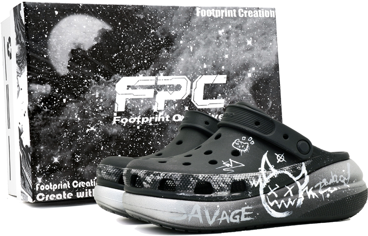 Оригинальная обувь, использованная в этой модели, - это туфли Cros Classic Crush с перфорацией, артикул 207521-001, черный. Эта пара кроссовок с перфорацией вдохновлена уличным граффити, сочетая темные тренды с нарисованными вручную элементами, создавая визуальное напряжение, наполненное бунтарским духом. Общий тон основан на черно-сером градиенте с белыми элементами, нарисованными вручную, включая смайлики дьявола, символы граффити, «SAVAGE» и другие слова, что демонстрирует сильную индивидуальность и авангардный характер. Дизайн вдохновлен вызовом правилам и самовыражением в «андеграундной культуре трендов», стремясь разрушить устоявшийся стереотип о кроссовках с перфорацией и объединить комфорт и моду. Толстая подошва не только визуально удлиняет ноги, но и улучшает отскок и поддержку при носке. Это модная и веселая модель, которая действительно сочетает в себе «мягкий внешний вид и острый внутренний».