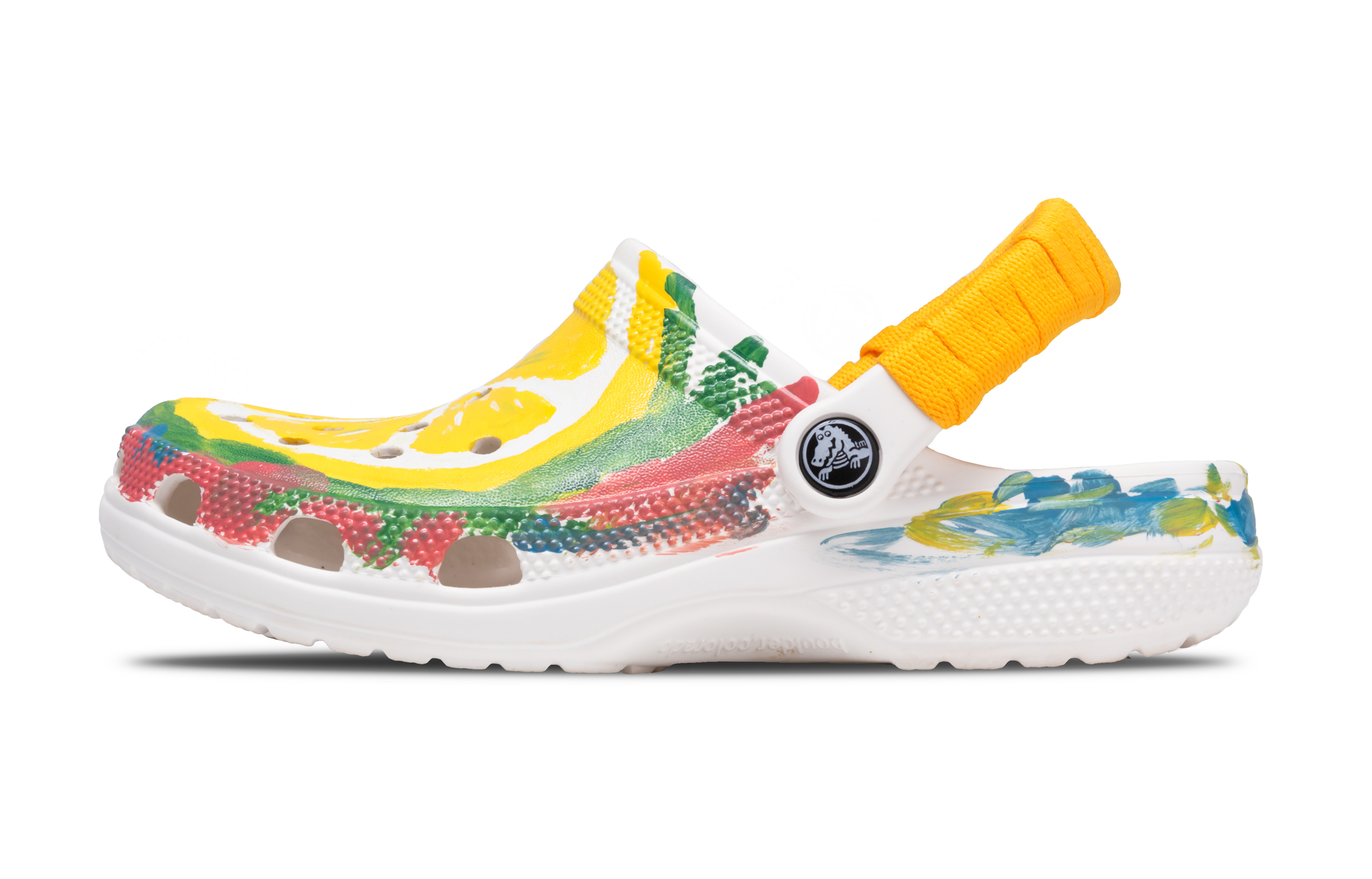 Обувь, изготовленная на заказ, представляет собой пляжные сабо Crocs Classic Clog EVA 2 см, унисекс, артикул 10001-100. Обувь отличается яркими цветами, а эффектный рисунок в виде желтого лимона на верхе создает ощущение свежести и бодрости. Лимоны, фрукты, богатые витамином С, символизируют здоровье и жизненную силу. Этот рисунок напоминает о солнечных, освежающих летних днях, передавая позитивный настрой. Окружающие зеленые и красные акценты усиливают визуальный эффект, создавая яркую и игривую атмосферу. Сабо обладают естественной воздухопроницаемостью, что делает их подходящими для жаркой погоды. Сохраняя свою основную функциональность, эта обувь благодаря индивидуальному дизайну рисунка предлагает как практичность, так и стильную эстетику, удовлетворяя потребности покупателей в комфорте и стиле в самых разных ситуациях.