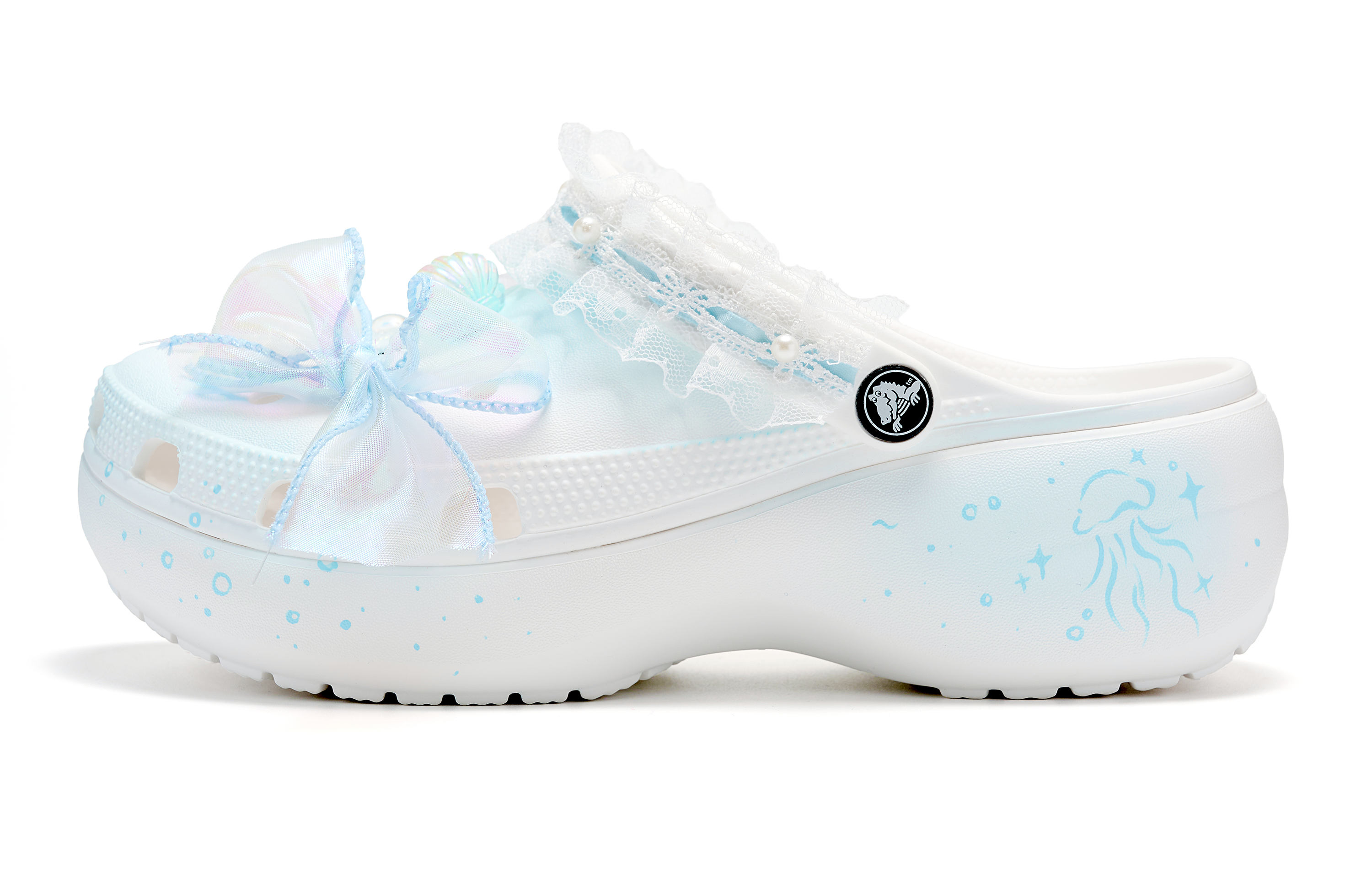 Кроссовки Crocs Hole, артикул 206750-100, создают романтическую атмосферу на фоне темного ночного неба, океана и мягкого кружева. Основной цвет кроссовок - бело-голубой градиент с прозрачностью морской соли, словно мерцающие волны под солнцем. Боковая часть украшена морскими элементами, такими как медузы и морские звезды, что позволяет тихо течь ритму и таинственности океана. Кроссовки с индивидуальным дизайном можно носить и стирать как обычно. Старайтесь избегать интенсивных физических нагрузок и царапин от острых предметов во время носки. Избегайте использования сильно концентрированных органических растворителей. При чистке рекомендуется использовать мягкую щетку и моющее средство подходящей концентрации.