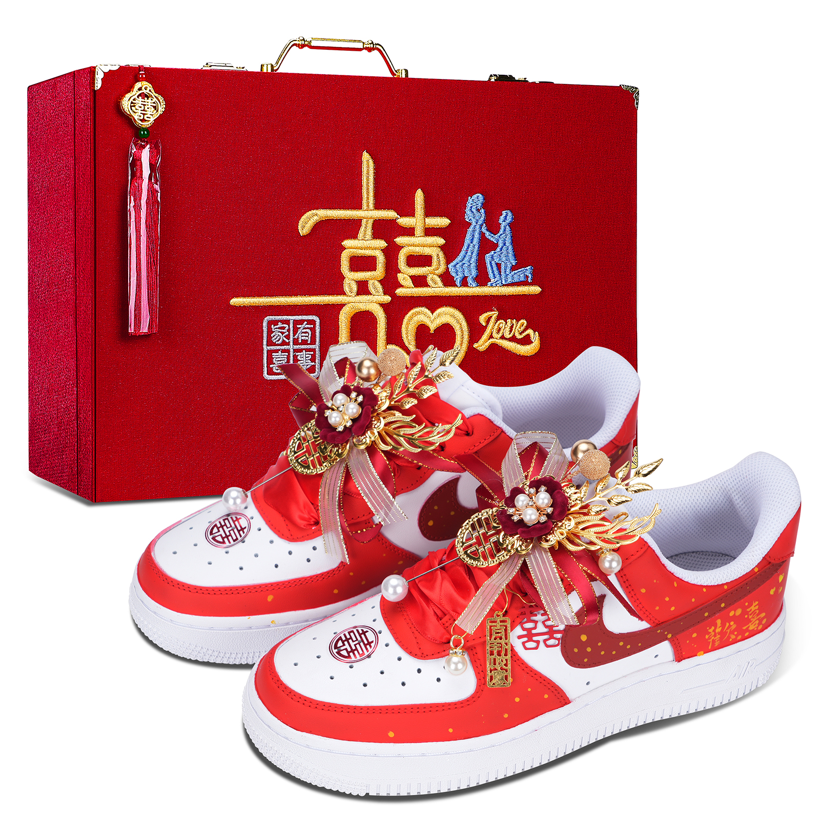 Эта пара, изготовленная на заказ, представляет собой оригинальную модель Nike Air Force 1, артикул DD8959-100, с дополнительными артикулами (cw2288-111 и DH2920-111). Классический силуэт выполнен в китайском стиле и относится к категории унисекс. Кроссовки, посвященные свадьбам, свадебной обуви и году рождения, идеально подойдут для торжественных случаев. Верх выполнен из коровьей кожи ярко-красного цвета с акцентом на темно-красный логотип и золотой горошек. Жемчуг и подвеска в виде иероглифа «счастье» украшают переднюю часть, создавая поистине элегантный и стильный образ. Кроссовки поставляются в фирменной подарочной коробке премиум-класса и с защитным чехлом для обуви.