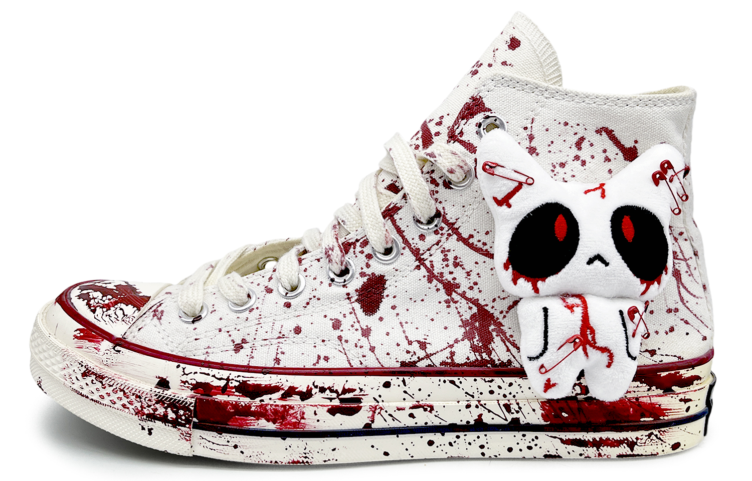 Эти кастомные кроссовки представляют собой оригинальную классическую модель Converse Chuck Taylor 1970-х годов, модные, нескользящие и прочные высокие парусиновые кеды для мужчин и женщин. Дизайн кроссовок вдохновлен красными чернилами, напоминающими следы крови. Фигурка кролика подчеркивает темный оттенок кроссовок, создавая яркий контраст, усиливающий визуальный эффект и создающий выразительный образ. Фотографии сделаны с оригинальных кроссовок, поэтому возможны небольшие отклонения в рисунке и цвете. Все кастомные кроссовки изготавливаются вручную, поэтому каждая пара будет иметь небольшие различия.