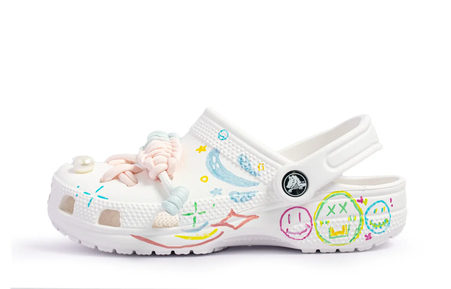 Эти туфли изготовлены на заказ из материала Crocs Classic Clog EVA белого цвета, артикул: 1000-100. Вдохновение пришло из молочного коктейля, состоящего из синего неба и моря, сияющего, словно звезды. Верхняя часть сплетена из небесно-голубых градиентных шнурков, создающих волнующиеся волны, а в носок вмонтирована прозрачная бусина Bobo, которая имитирует миниатюрные волны. Когда вы наступаете на нее, звездная пена взмывает, словно окутывая ваши пальцы целым куском солнечного и морского бриза. В комплекте – мечтательный фильтр, сладость клубники и милый Bobo, словно чашечка кокетливого молочного чая.