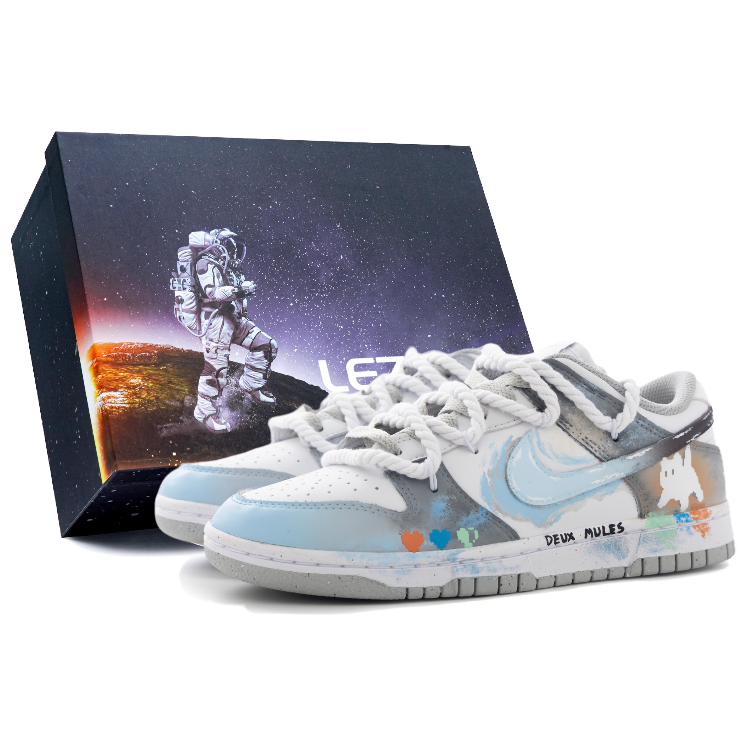 Эти кроссовки, изготовленные на заказ, представляют собой оригинальную модель Nike Dunk. Вдохновленные серией граффити с кошками, кроссовки получили название Weird Kitten. Сочетание белого, серого и синего цветов с графическими акцентами создает простой, но элегантный образ.