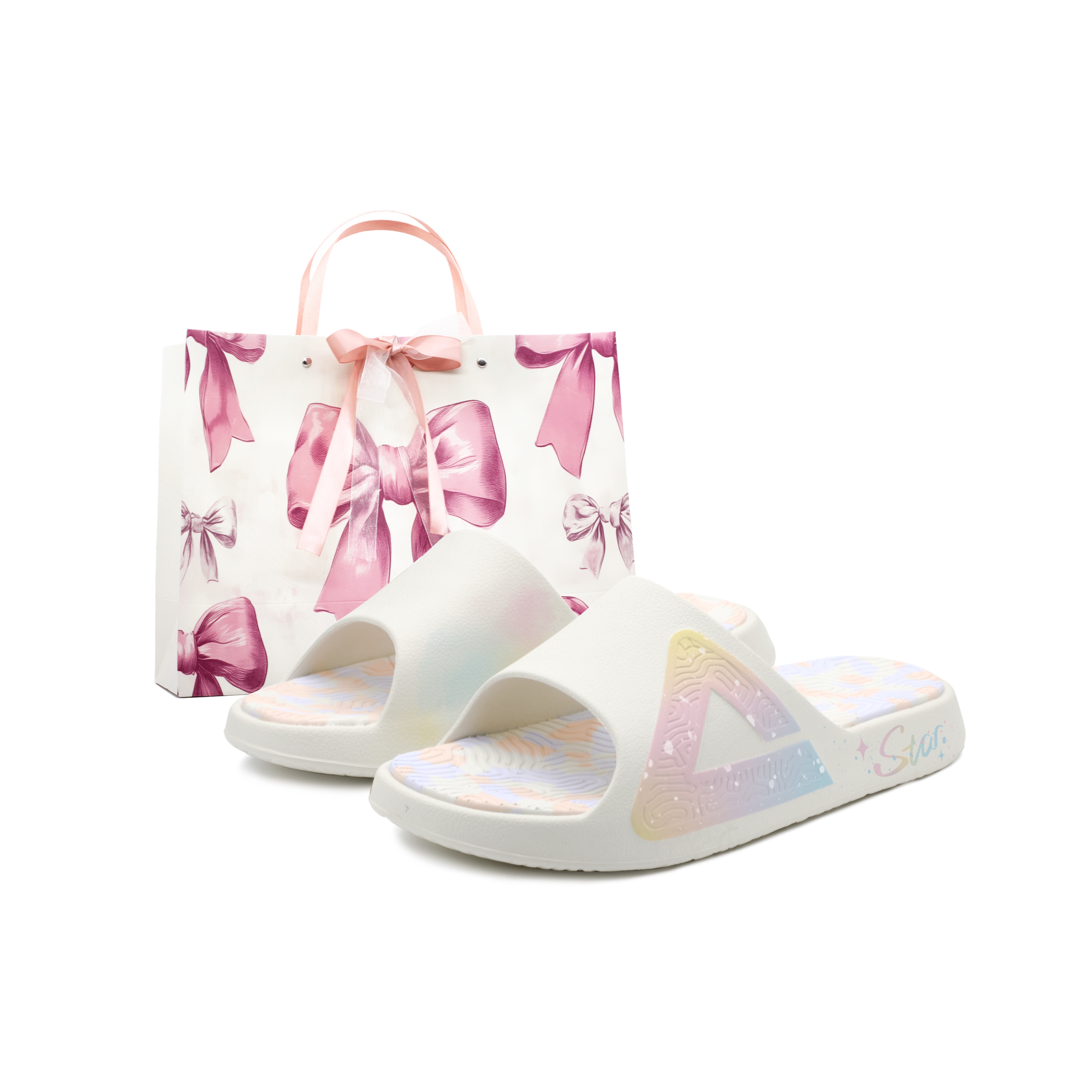 Эти туфли из серии Peak Taiji Sandals представлены в едином стиле для мужчин и женщин. Артикул E13958L (белый холст), а также дополнительный артикул E13958L. Основная часть кроссовок выполнена в белом цвете, а верх украшен большим градиентным треугольником. Цвет плавно переходит от розового к желтому и синему, а текстура волнистая. На задней части подошвы расположены разноцветные звездочки и узоры из маленьких звездочек. Общий стиль свежий, милый и спортивный.