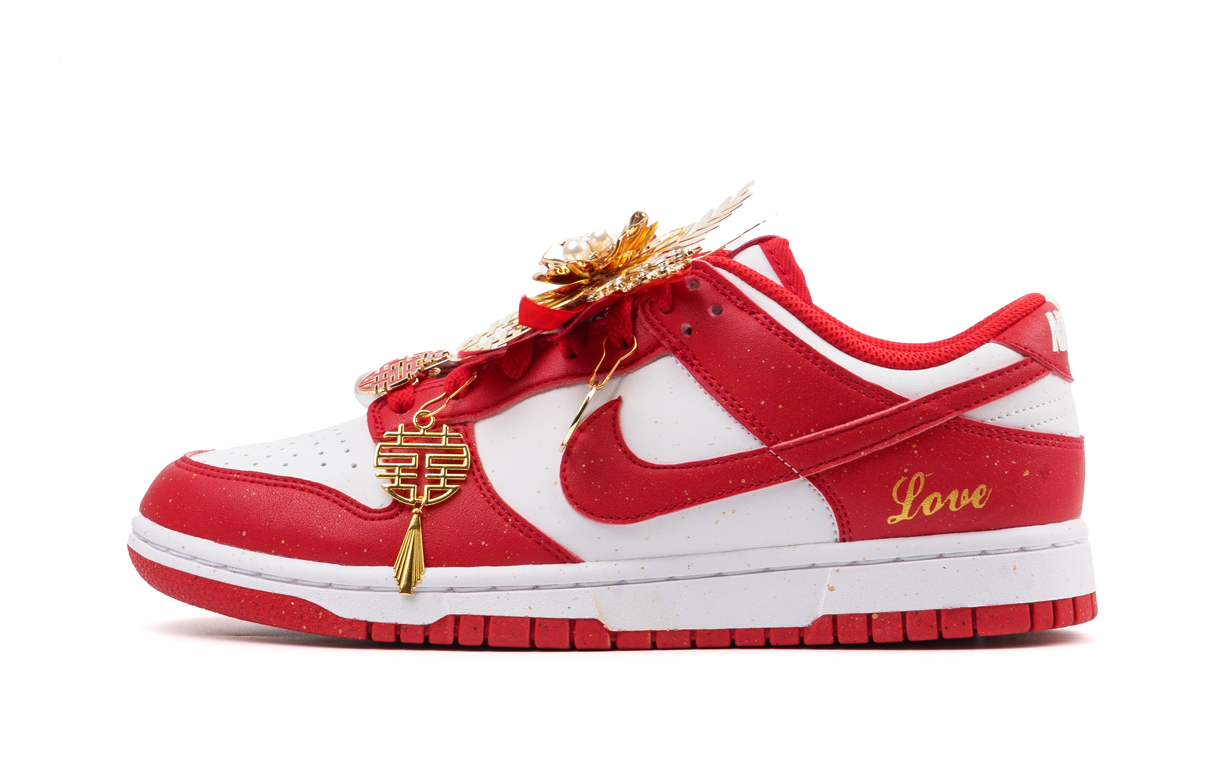 Оригинальные кроссовки Nike Dunk, использованные в этом кастомном образце. Вдохновленное радостью свадьбы, было выбрано сочетание красного цвета (оригинальный цвет был изменен на красно-золотой, а подвески на туфли были добавлены для усиления визуального эффекта и подчеркивания общего праздничного стиля свадьбы).