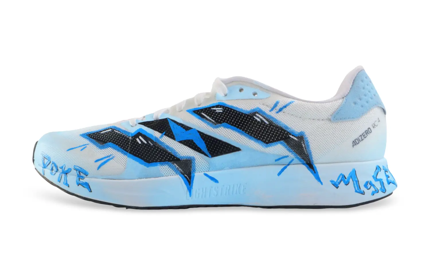 Эти кроссовки изготовлены на основе оригинальных кроссовок adidas Adizero RC4 Elite Mesh, удобных и универсальных, с амортизацией и износостойкостью, с низким верхом и карбоновой пластиной. Они представлены в едином стиле для мужчин и женщин в белом и черном цветах. Артикул GX8152. Общая цветовая гамма – бело-синяя, с элементами граффити, выполненными вручную, что добавляет ощущение роскоши.
