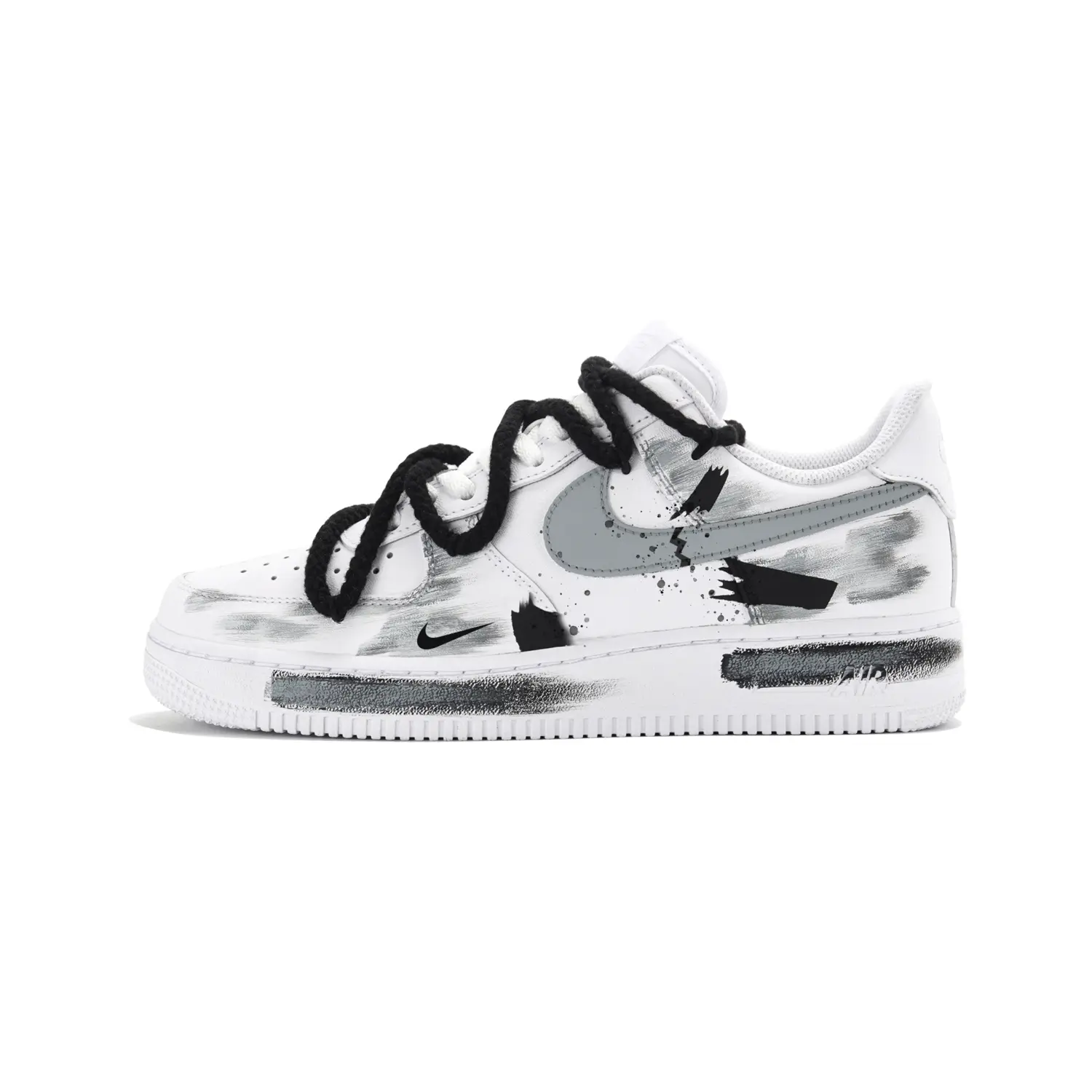 Эти кроссовки, изготовленные на заказ, представляют собой оригинальную модель женских кроссовок Nike Air Force 1 с низким верхом, нескользящей, износостойкой и легкой подошвой, выполненную в бело-синем цвете. Дизайн вдохновлен уличным граффити: в качестве темы использованы элементы пэчворка, а брызги чернил подчеркивают художественные детали кроссовок.