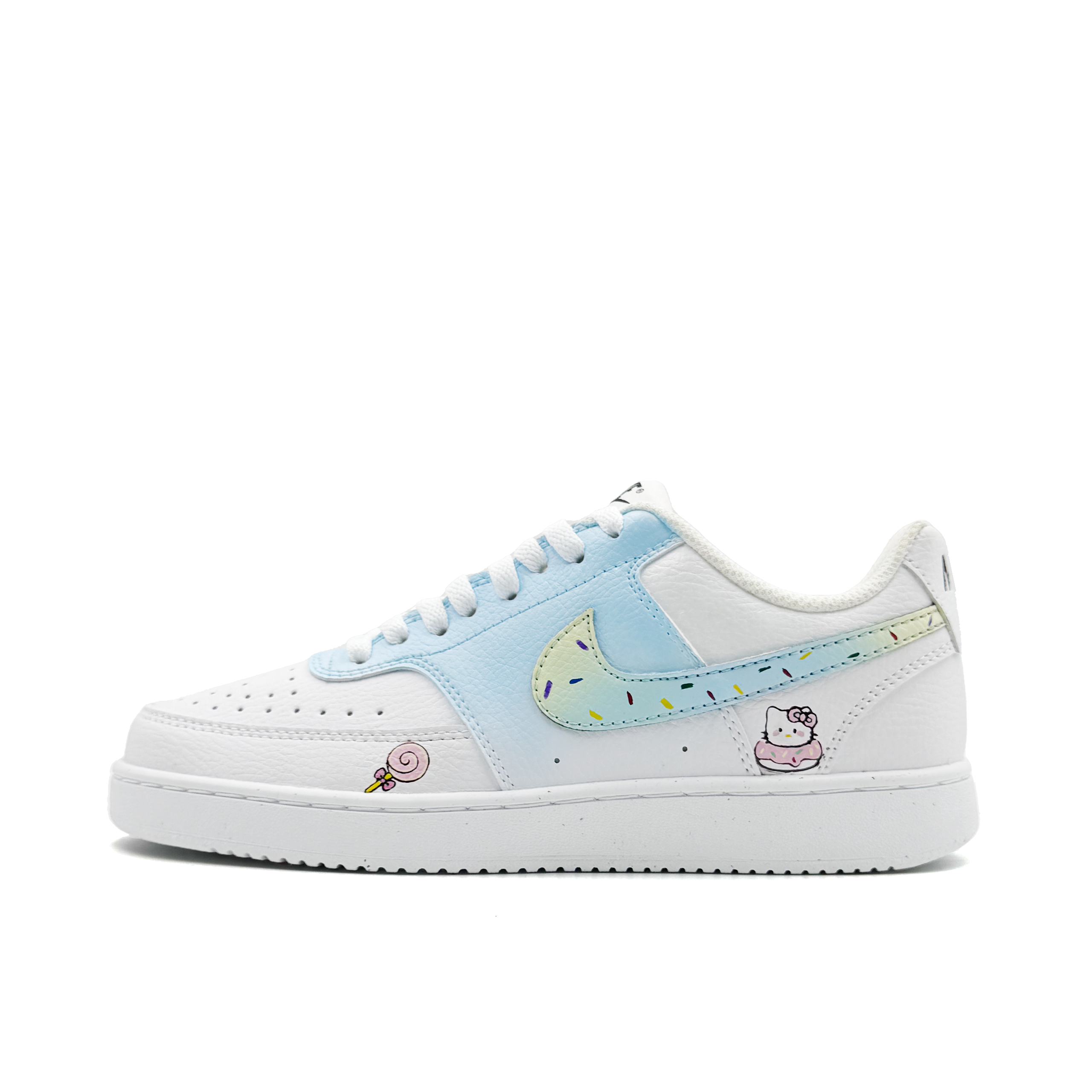 Эта кастомная версия представляет собой оригинальную модель Nike Court Vision 1 Donut Strike - удобные, универсальные, симпатичные и модные низкие кроссовки с ручной росписью для кампуса. Кроссовки доступны в белом и синем цветах, как для мужчин, так и для женщин. Вдохновленные пончиками, эти кроссовки стали классикой.