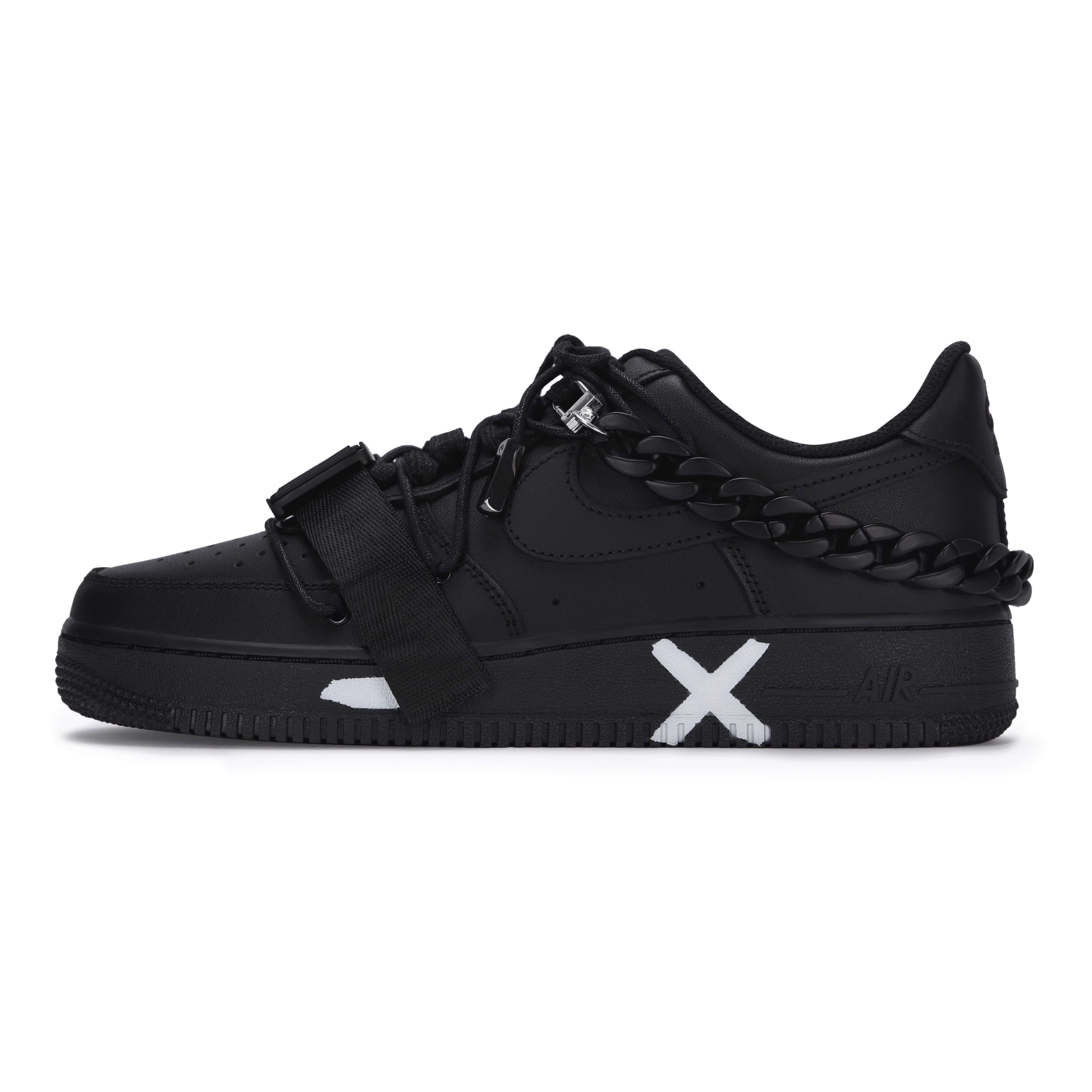 Эти кроссовки, изготовленные на заказ, представляют собой оригинальную модель ретро-кроссовок Nike Air Force 1 Low '07, артикул CW2288-111. Вдохновленные современным трендом на темный, функциональный стиль, они отличаются характерным дизайном пряжки и деконструированной эстетикой, создающей уникальный визуальный эффект.