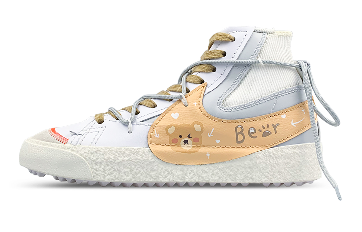 Эта кастомизированная версия кроссовок основана на оригинальной модели Nike Blazer. Модель вдохновлена свежей и элегантной бело-желто-серой цветовой гаммой, а изображение медведя добавляет немного девичьей миловидности. Общая цветовая гамма модная и актуальная, универсальна и подходит всем.