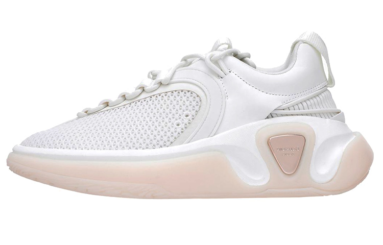 Кроссовки B-Runner из белой прорезиненной кожи и сетки с асимметричными белыми шнурками, белой нашивкой из термополиуретана и тисненым логотипом Balmain в тон на язычке, подошвой из белой резины и полиуретана и нашивкой с логотипом Balmain цвета розового золота на внешней стороне.