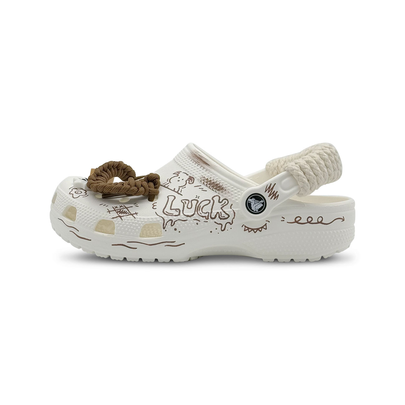Эти туфли изготовлены на заказ на основе оригинальной модели Crocs Classic Clog с артикулом 10001-100. Дизайн дополнен интересными веревочными узлами и пряжками в стиле мультфильмов, а поверхность расписана вручную граффити. Милые и персонализированные узоры просты и изысканны.