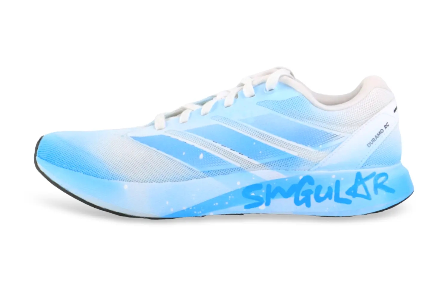 Эта кастомная версия кроссовок основана на оригинальной модели adidas Duramo RC. В дизайне кроссовок использовано сочетание градиентных синих и белых чернил с английскими надписями, что делает дизайн простым, но не примитивным.