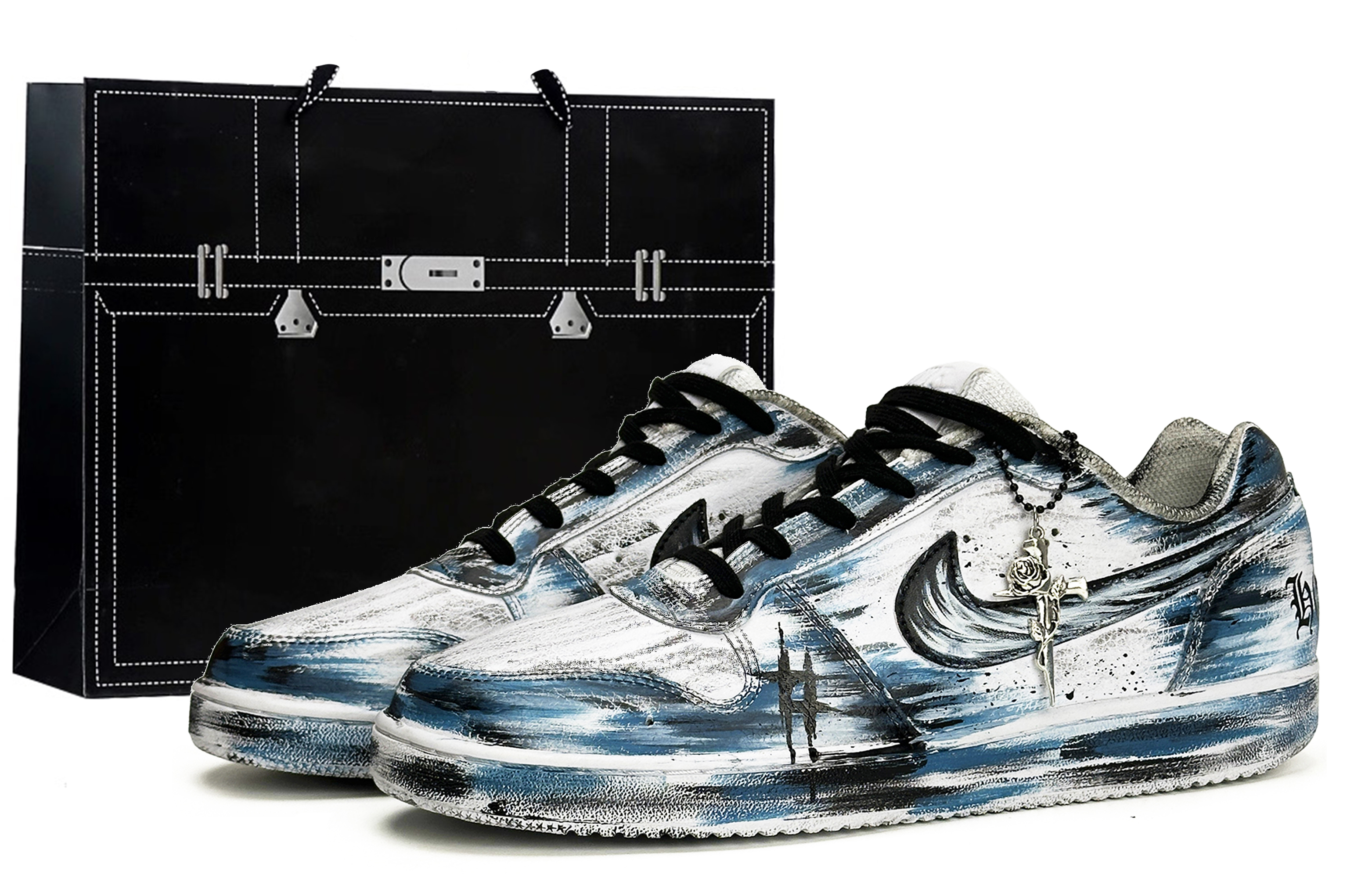 Эти кастомные кроссовки - чисто-белые мужские кроссовки Nike EBERNON Low, артикул AQ1775-100. Дополнительный артикул - AQ1779-100. Оригинальный дизайн кроссовок выбран случайным образом. Вдохновлены готической моделью Shadow Thorn Rose.