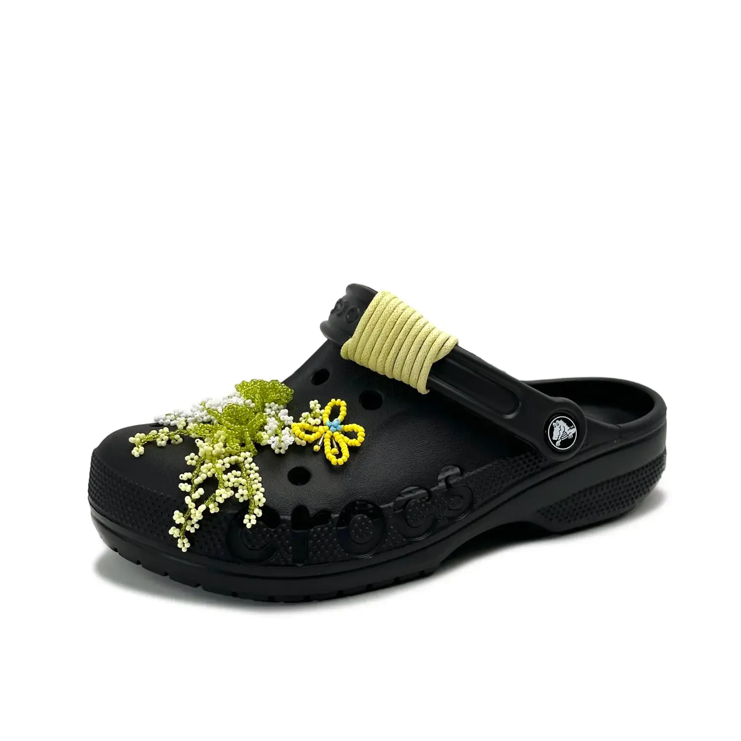 Эти туфли на заказ - оригинальные сандалии Crocs Classic Clog EVA Beach Hole, высота 2 см, унисекс, черного цвета, артикул 10126-001. Вдохновением послужила природа: порхающие бабочки над зелеными полями.