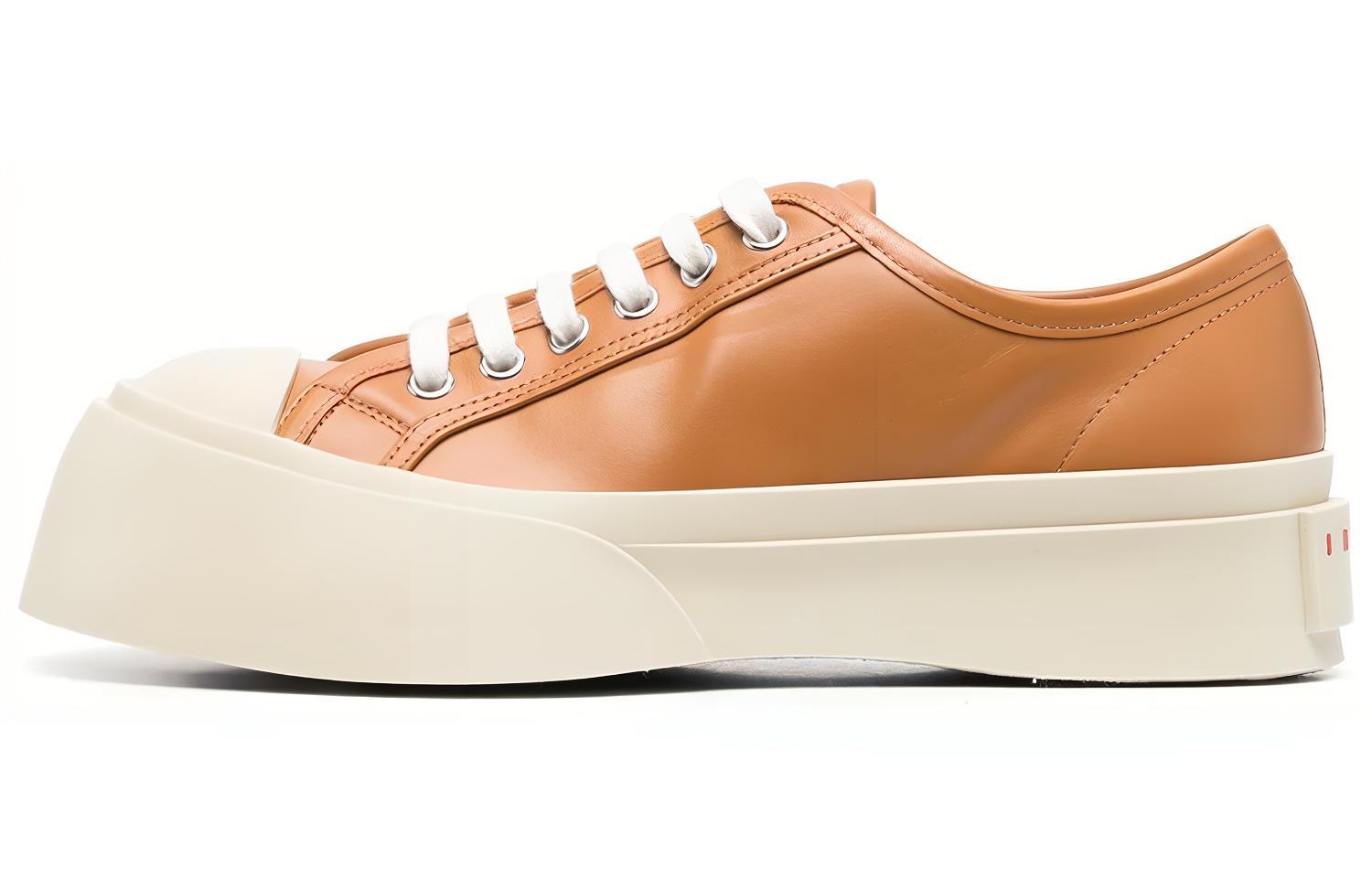 Низкие кожаные кеды Marni Pablo верблюжьего коричневого цвета из телячьей кожи с нашивкой-логотипом на язычке, шнуровкой спереди, миндалевидным носком, кожаной стелькой с логотипом и толстой подошвой.