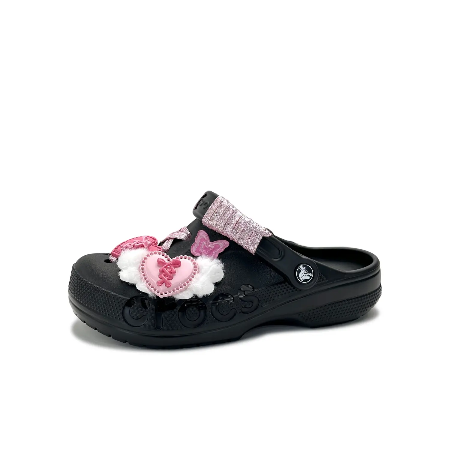 Обувь, изготовленная на заказ, - это сандалии Crocs Classic Clog EVA Beach Hole Sandals (2 см, унисекс, черного цвета), артикул 10126-001. Дизайн обуви вдохновлен розовой куклой Барби.