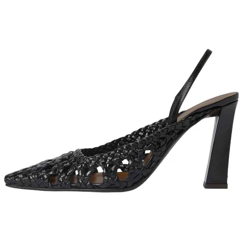 Плетеные кожаные туфли с открытой пяткой, квадратным носком и воротником, эластичной вставкой на ремешке сзади и блочным каблуком с металлической строчкой.