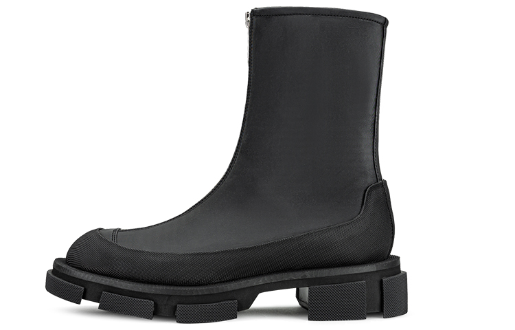 Застежка-молния спереди, круглый носок, толстая резиновая подошва и серебристая фурнитура.