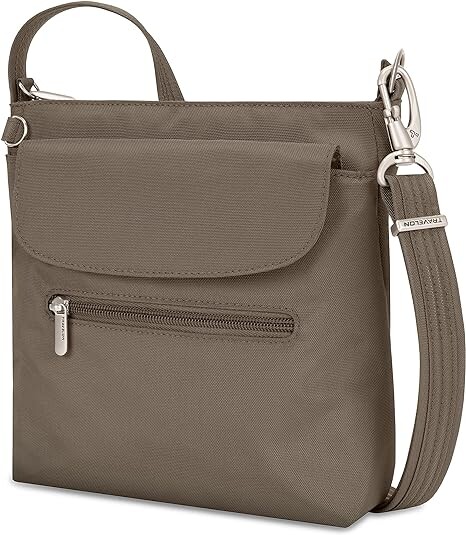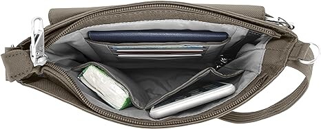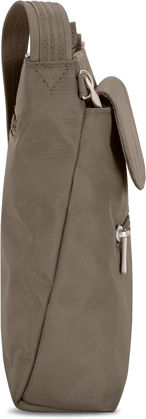 Сумка с регулируемым ремнем через плечо, застегивается на молнию. Передний карман на молнии надежно закрывается клапаном; передние и задние карманы на молнии. Внутренний органайзер с отделениями с RFID-блокирующей защитой карт и паспортов; два кармана в основном отделении.
