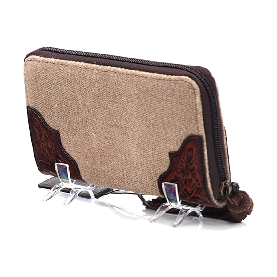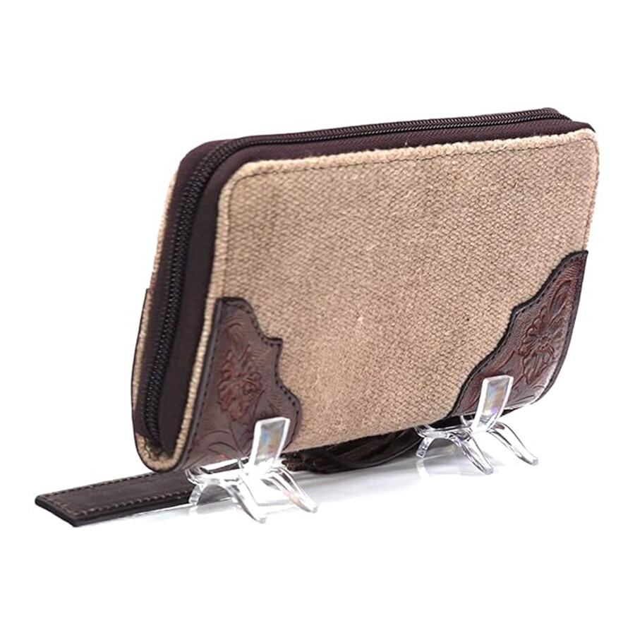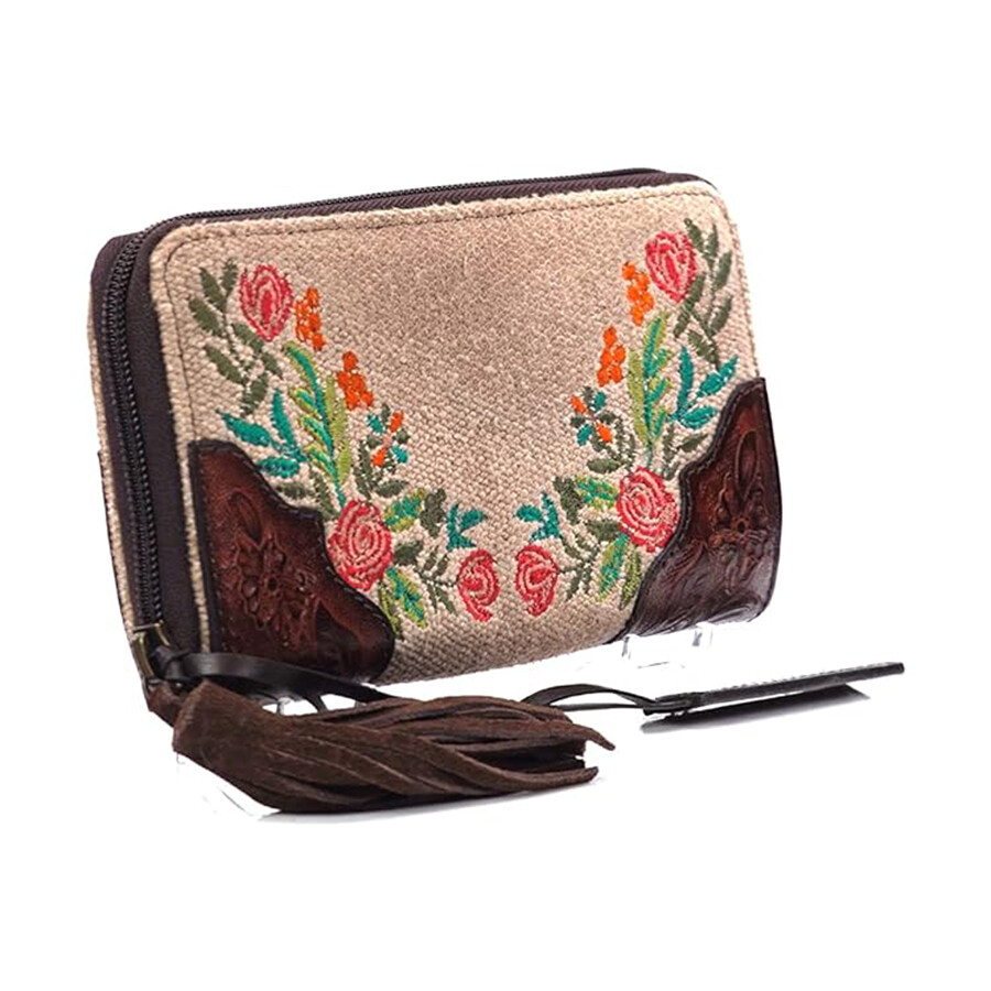 Удобный кошелек-клатч Ariat Cruiser. Он изготовлен из холста с красочным принтом. Коричневая кожа по краям и съемный ремешок на запястье с металлическими заклепками.