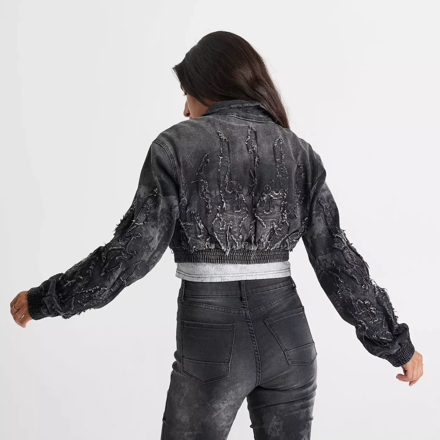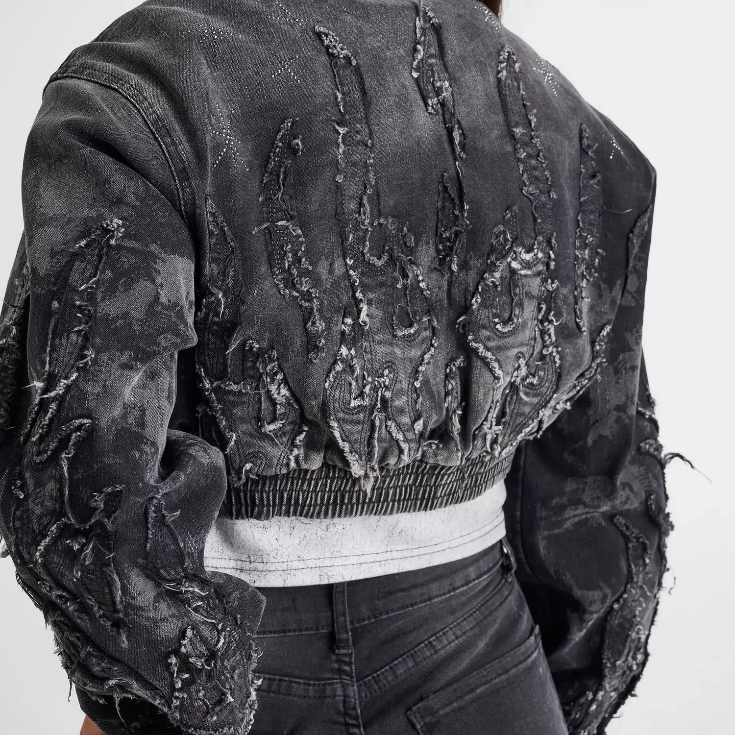 Куртка-бомбер из потертого денима с вышитым узором в виде пламени