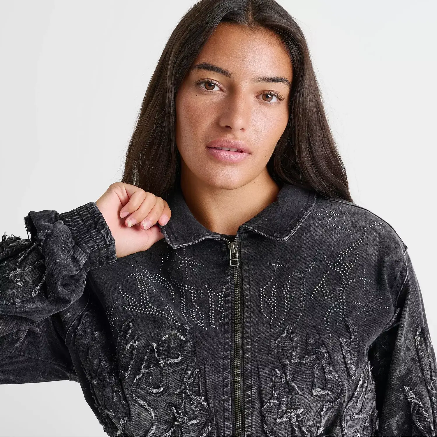 Выбирайте более прочную модель в байкерском стиле, например, эту женскую укороченную джинсовую куртку-бомбер Smoke Rise Christy. Эта куртка-бомбер с воротником из потертого денима украшена вышитыми пламенными стежками, что придает ей стильный уличный вид.