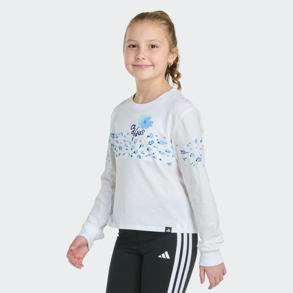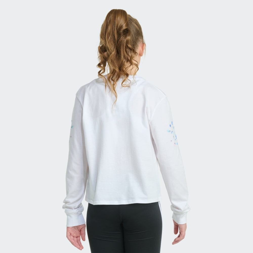 Выразите себя. Эта женская футболка adidas с длинным рукавом украшена игривой графикой спереди. Она создана для повседневного комфорта благодаря мягкому хлопковому крою и классическому крою.