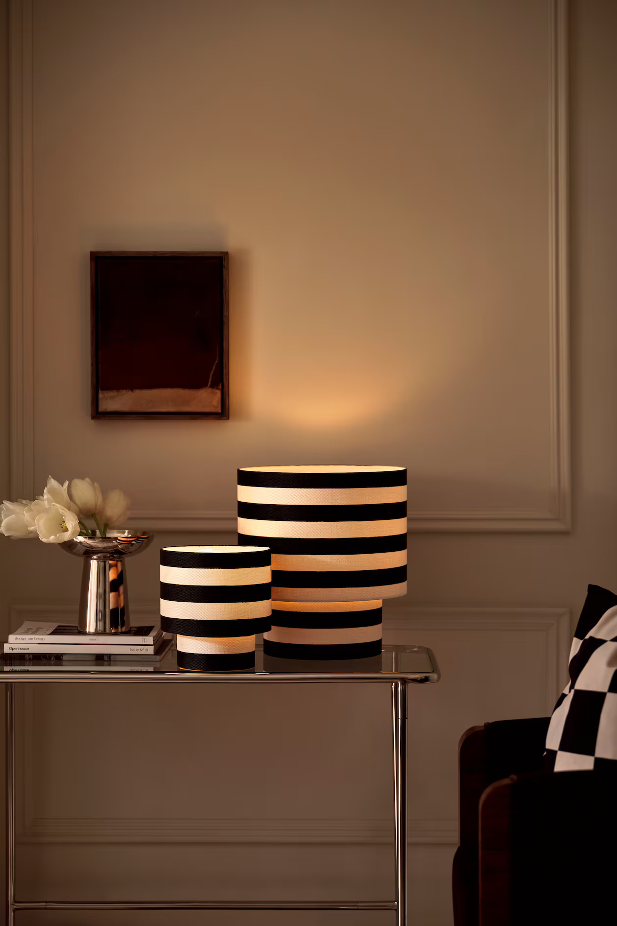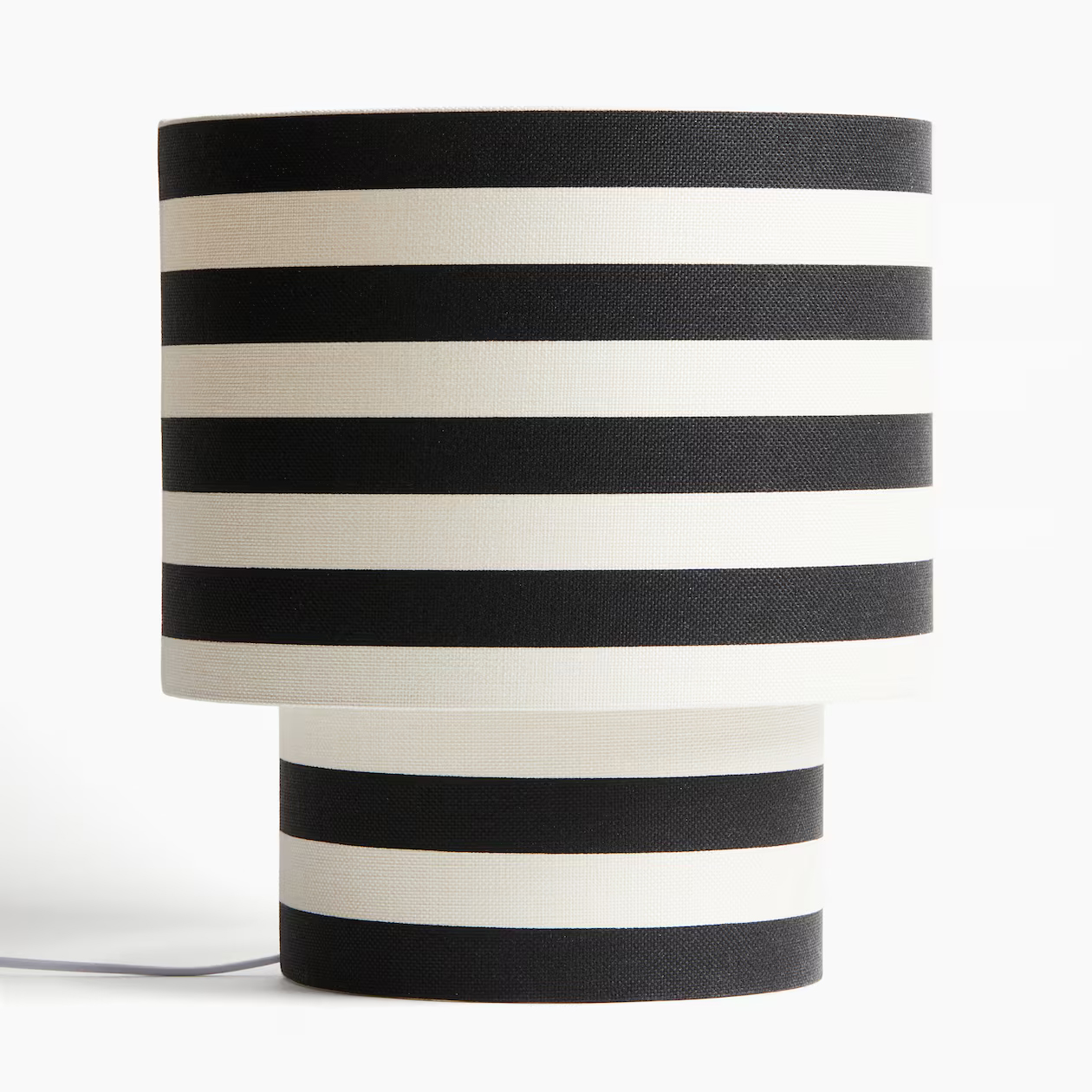 Освещенная приятным светом большая настольная лампа из льняной узорчатой ткани на проволочной стойке. Провод с пластиковым переключателем. Держатель лампы E27. Максимальная мощность светодиодной лампы 15 Вт. Общая высота ок. 36 см. Диаметр абажура ок. 32 см. Длина шнура 160 см.
