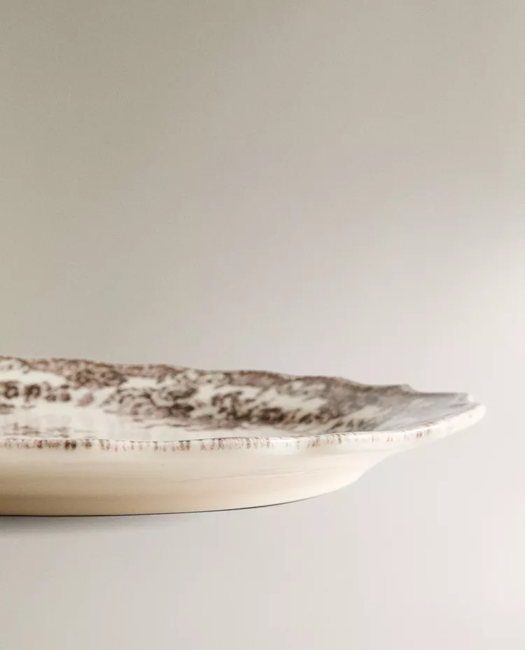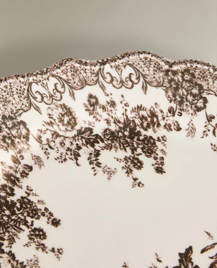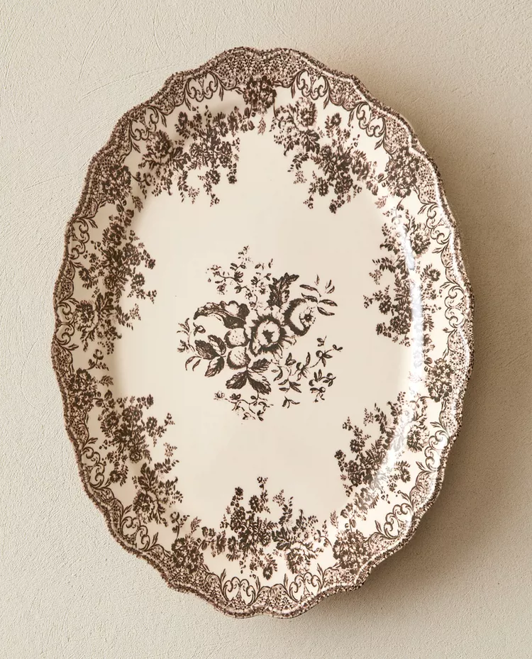Изящное глиняное сервировочное блюдо, украшенное цветочным принтом.