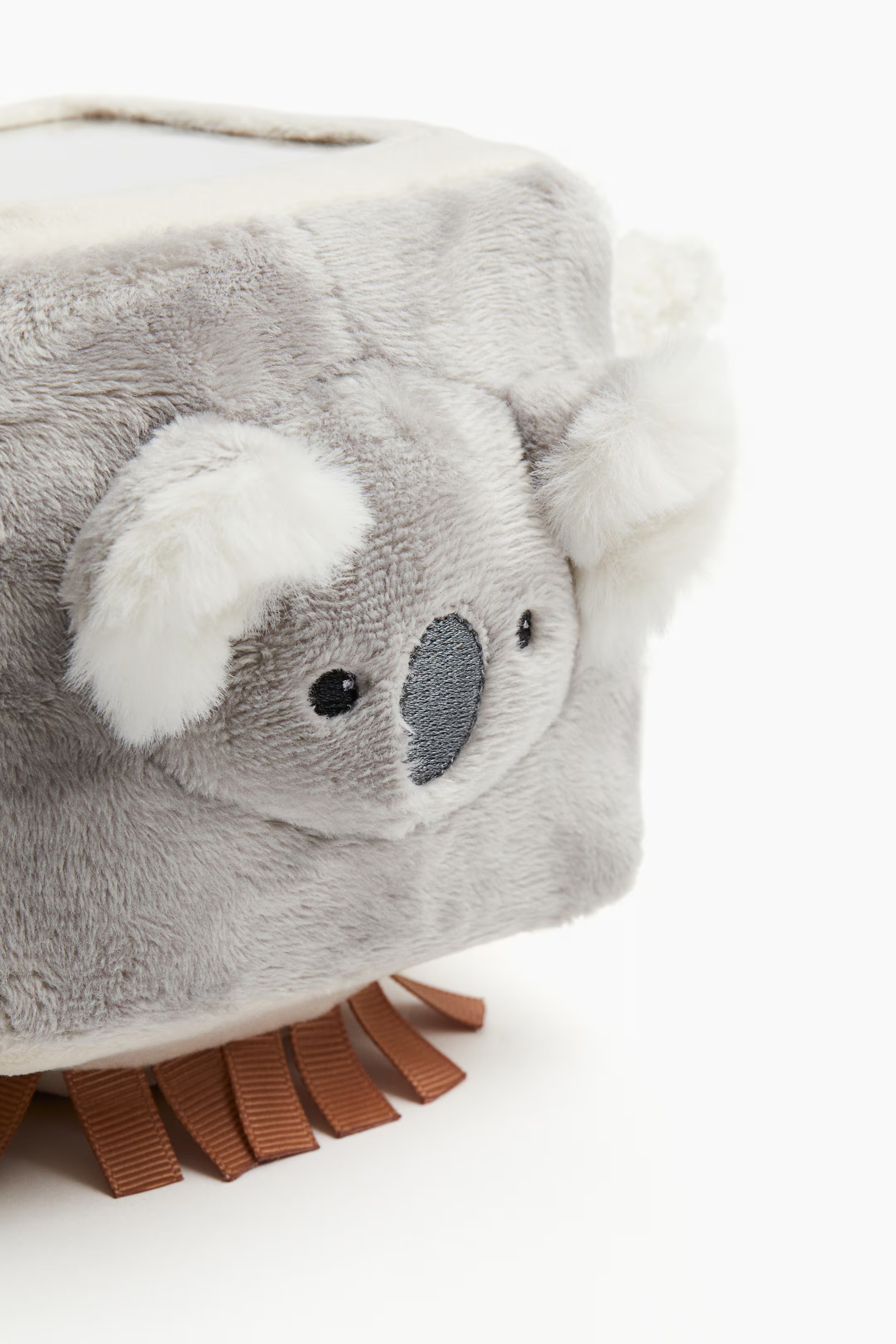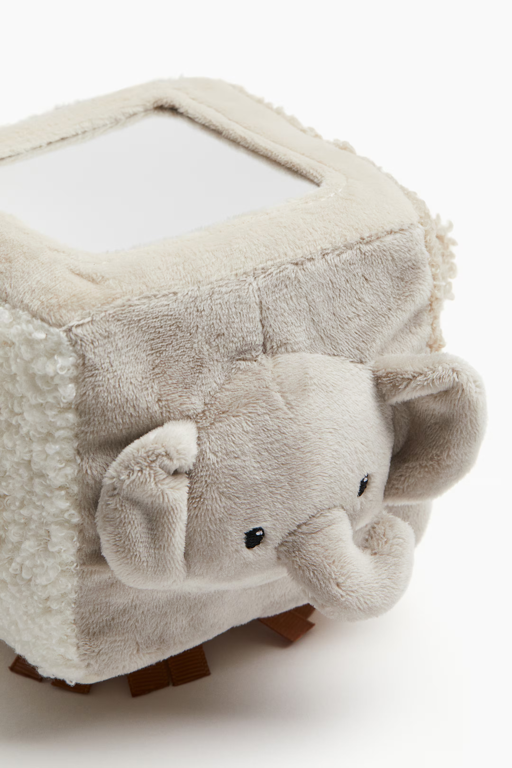 Интерактивная мягкая игрушка в форме куба, украшенная пластиковым зеркалом и слегка ватными мордами животных, некоторые из которых имеют шуршащие аппликации. Размеры 10x10x10 см.