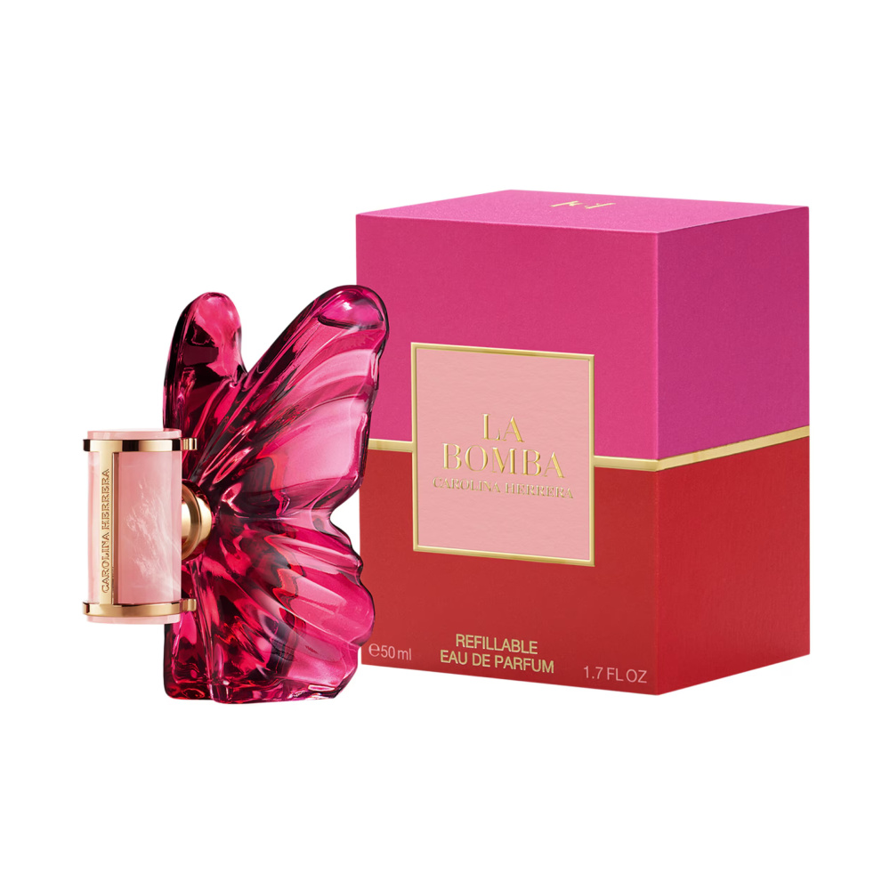 Флакон: La Bomba расправляет крылья. Символ мощного преображения в форме бабочки. Изящная стеклянная конструкция, словно драгоценный камень, отражает движение и свободу. В оттенках фуксии и розового она воплощает радостный цветочный взрыв.