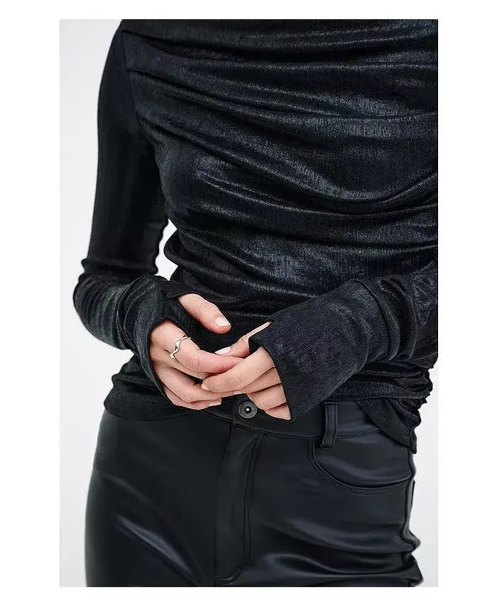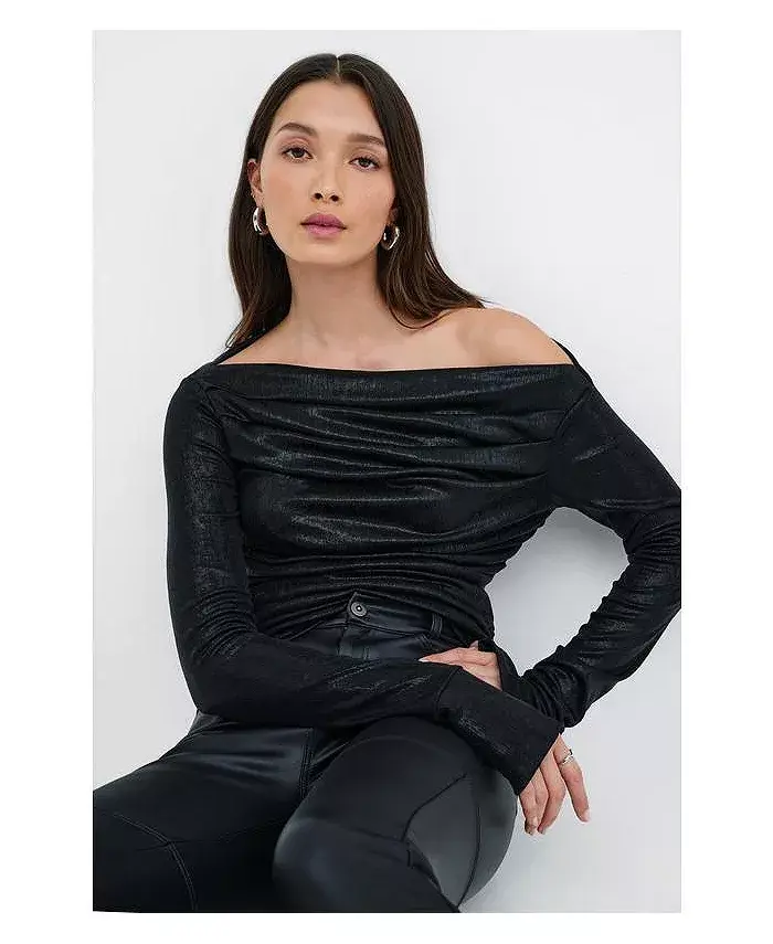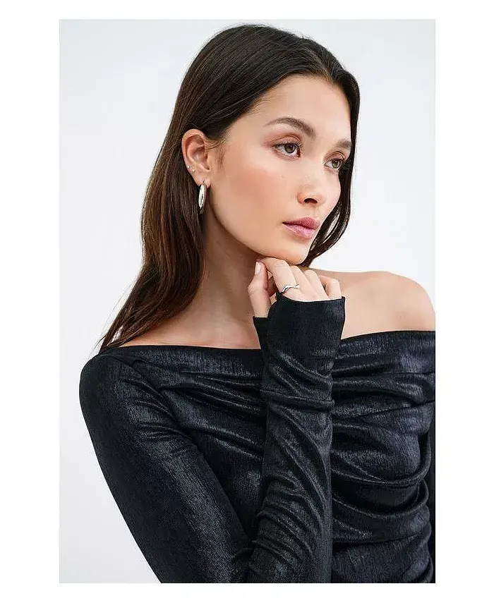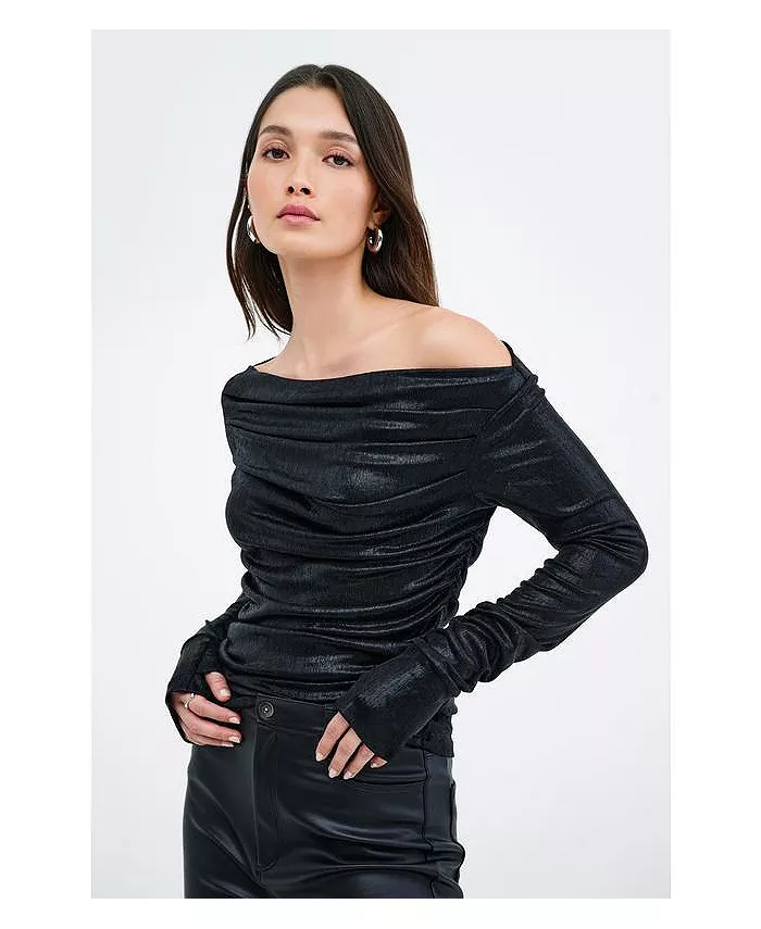 Топ Cooper Metallic от Marcella выполнен из светящейся ткани с металлическим блеском и высокой эластичностью. Он отличается сборками по бокам и эффектной драпировкой спереди и сзади. Широкий вырез-лодочка позволяет носить его на плече или с открытыми плечами, создавая эффектный образ, а отверстия для больших пальцев придают ему неожиданную изюминку.