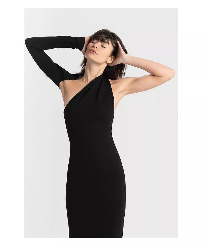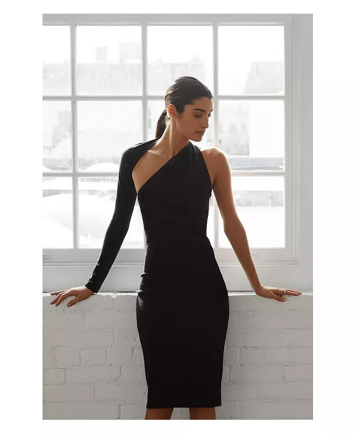 Импортный Длина около 33 дюймов Одинарный удлиненный рукав Асимметричный вырез на одно плечо Приталенный, средней эластичности Разработано в Нью-Йорке | Изготовлено вручную в Европе Приталенный фасон по груди, талии и бедрам, длина миди, силуэт на одно плечо. Слегка эластичный