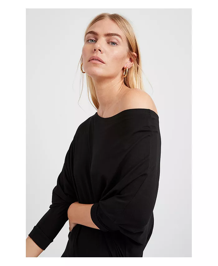 Широкий вырез «лодочка», можно носить как на плече, так и с открытыми плечами.