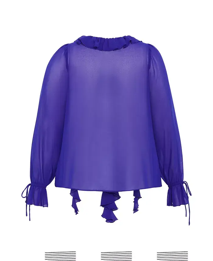 Длинные рукава с эластичными манжетами с оборками, свободный крой, многоуровневые передние детали с оборками, фасон надевается через голову, легкая прозрачная ткань, длина подол до бедер, рекомендуется носить с облегающими брюками и сапогами на высоком каблуке.