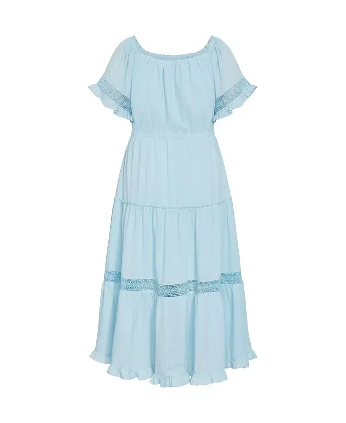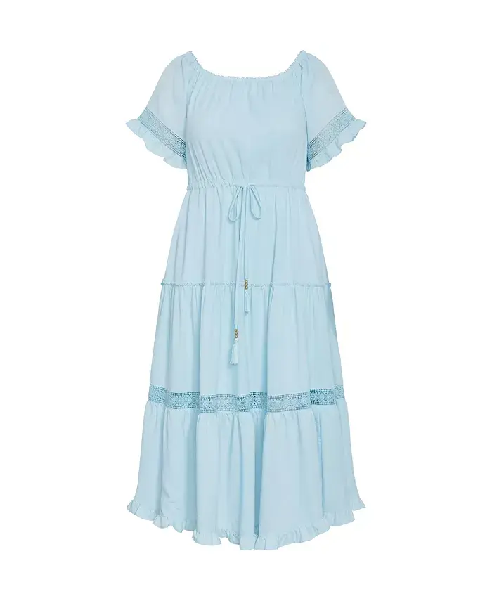 Мечтайте о шикарном стиле с платьем миди Angel. Это платье с вышитыми крючком деталями, многоярусной юбкой и короткими рукавами очаровывает взгляды своей утончённой элегантностью.