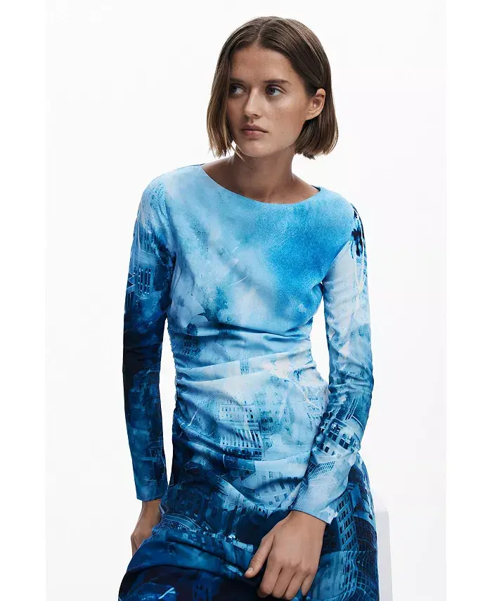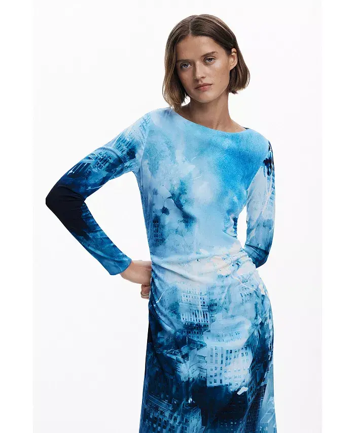 Длинное платье с вырезом «лодочка» и длинными рукавами, со сборками по бокам и принтом в виде городского пейзажа.