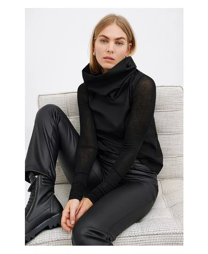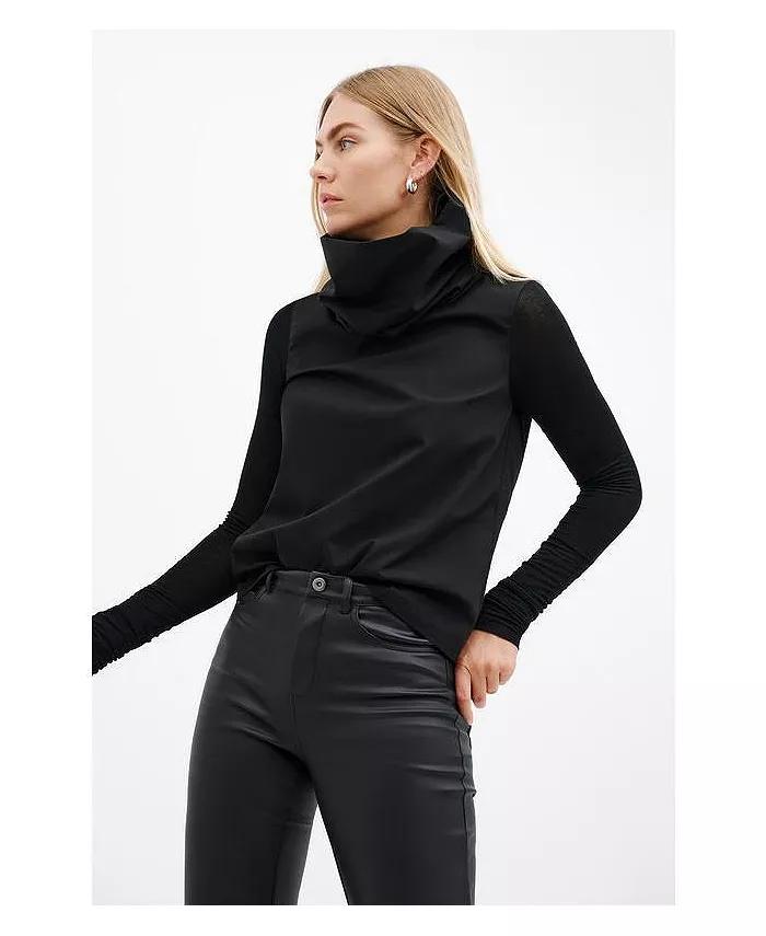Топ Atlantic от Марселлы с эффектным воротником оверсайз (который можно носить подвернутым или поднятым для создания объёма) и удлиненными рукавами с прорезями для больших пальцев из прозрачного европейского трикотажа, создающего эффектный фактурный эффект. Основная часть выполнена из плотного европейского поплина свободного кроя.