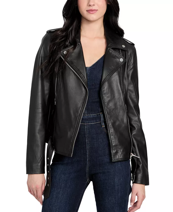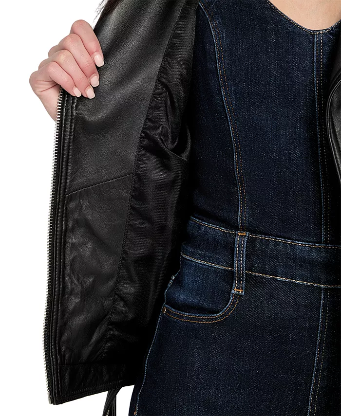 Женская асимметричная кожаная байкерская куртка с поясом GUESS, черный